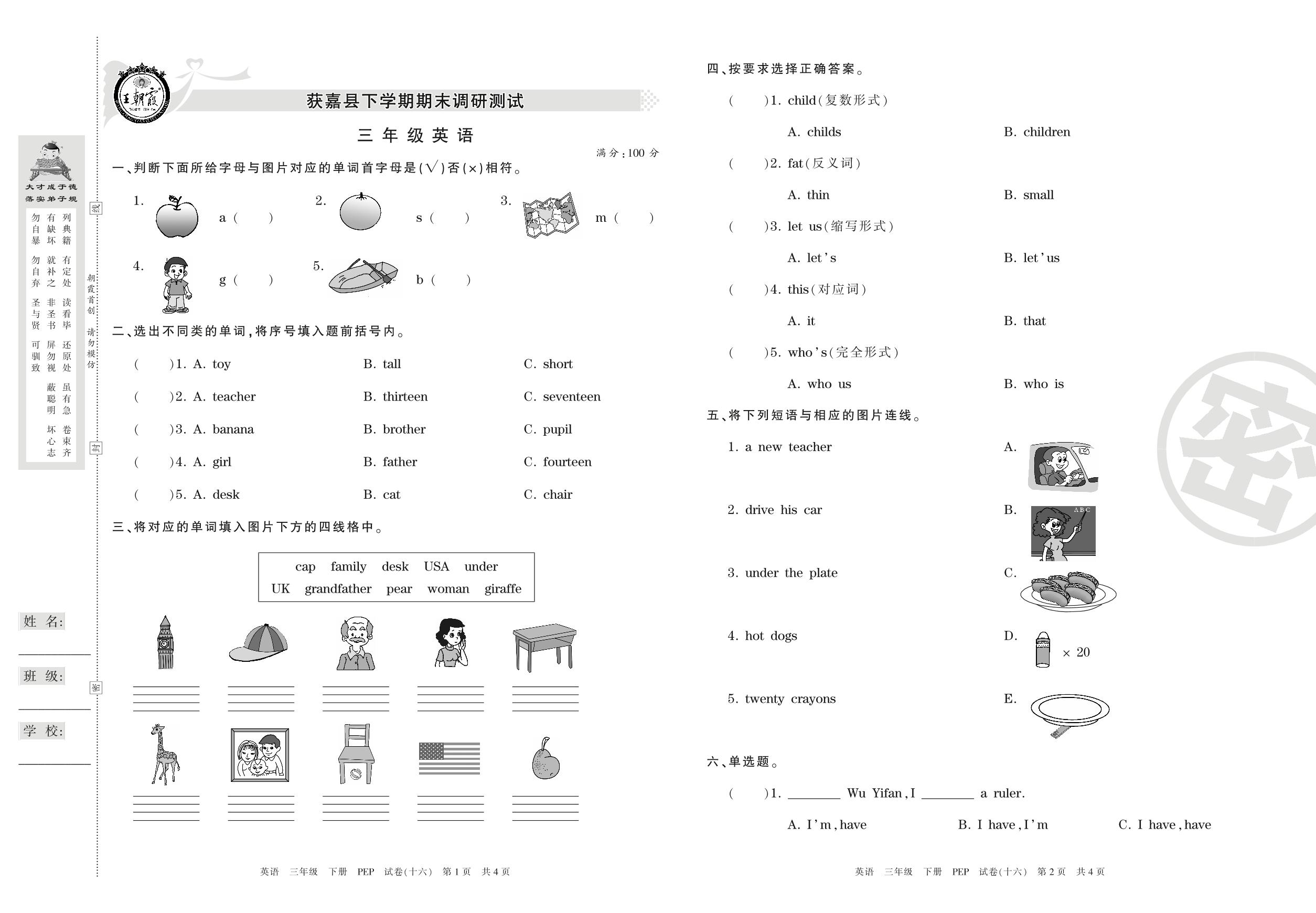 2015-2016学年第二学期新乡市获嘉县三年级英语试卷(PEP版)【16】