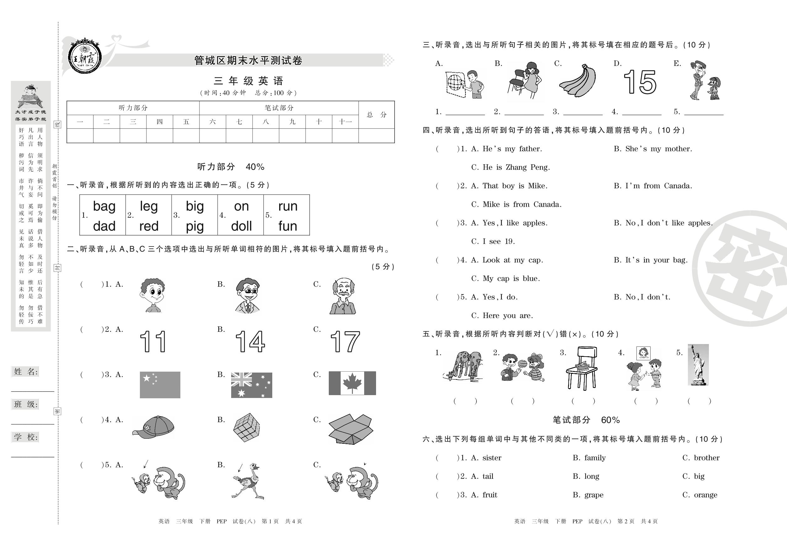 三年级英语人教PEP版(三起始)下册期末卷