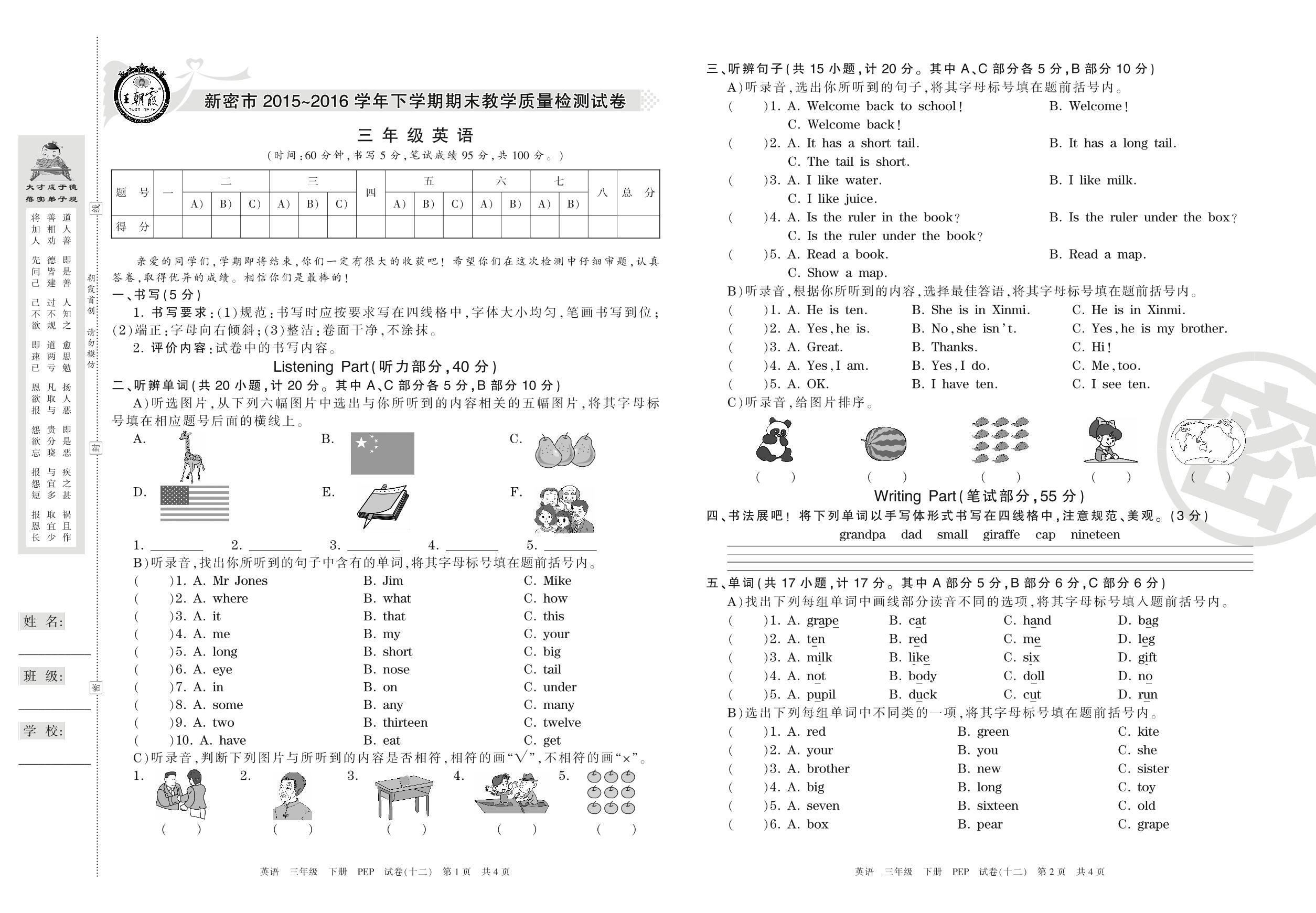 2015-2016学年第二学期新密市三年级英语试卷(PEP版)【12】