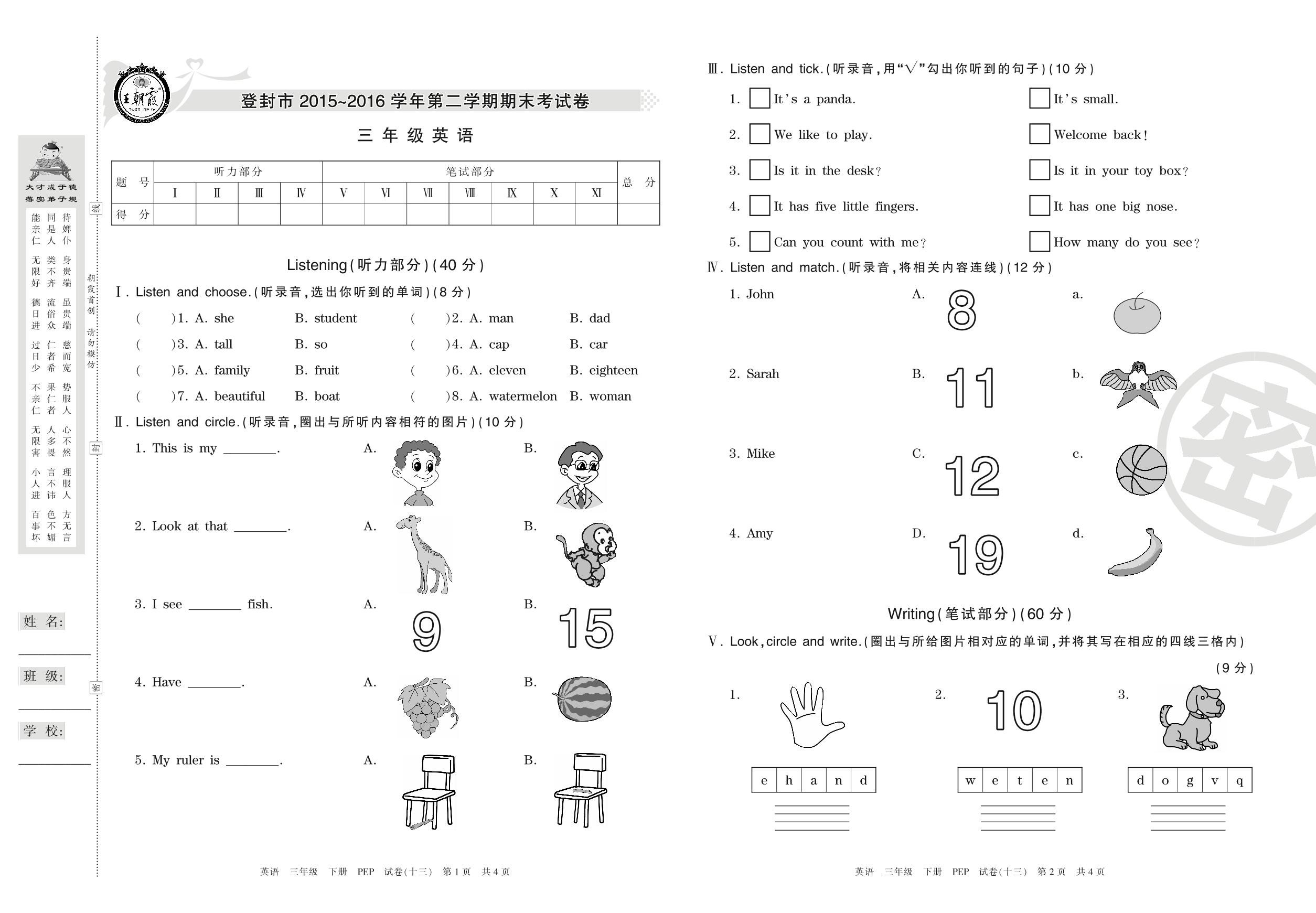 2015-2016学年第二学期登封市三年级英语试卷(PEP版)【13】