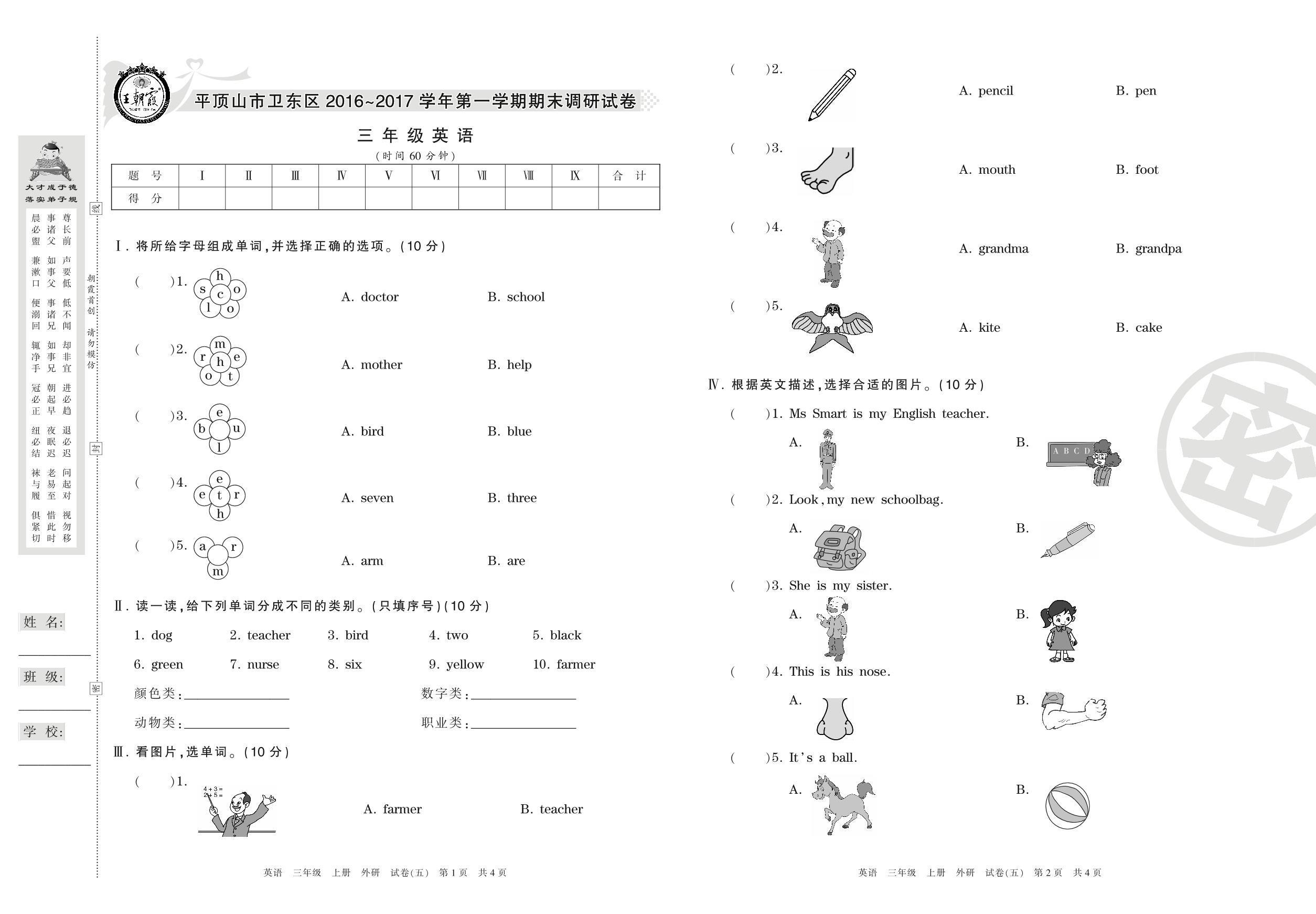 2016-2017学年第一学期平顶山市平顶山卫东区三年级英语试卷(外研版)【5】