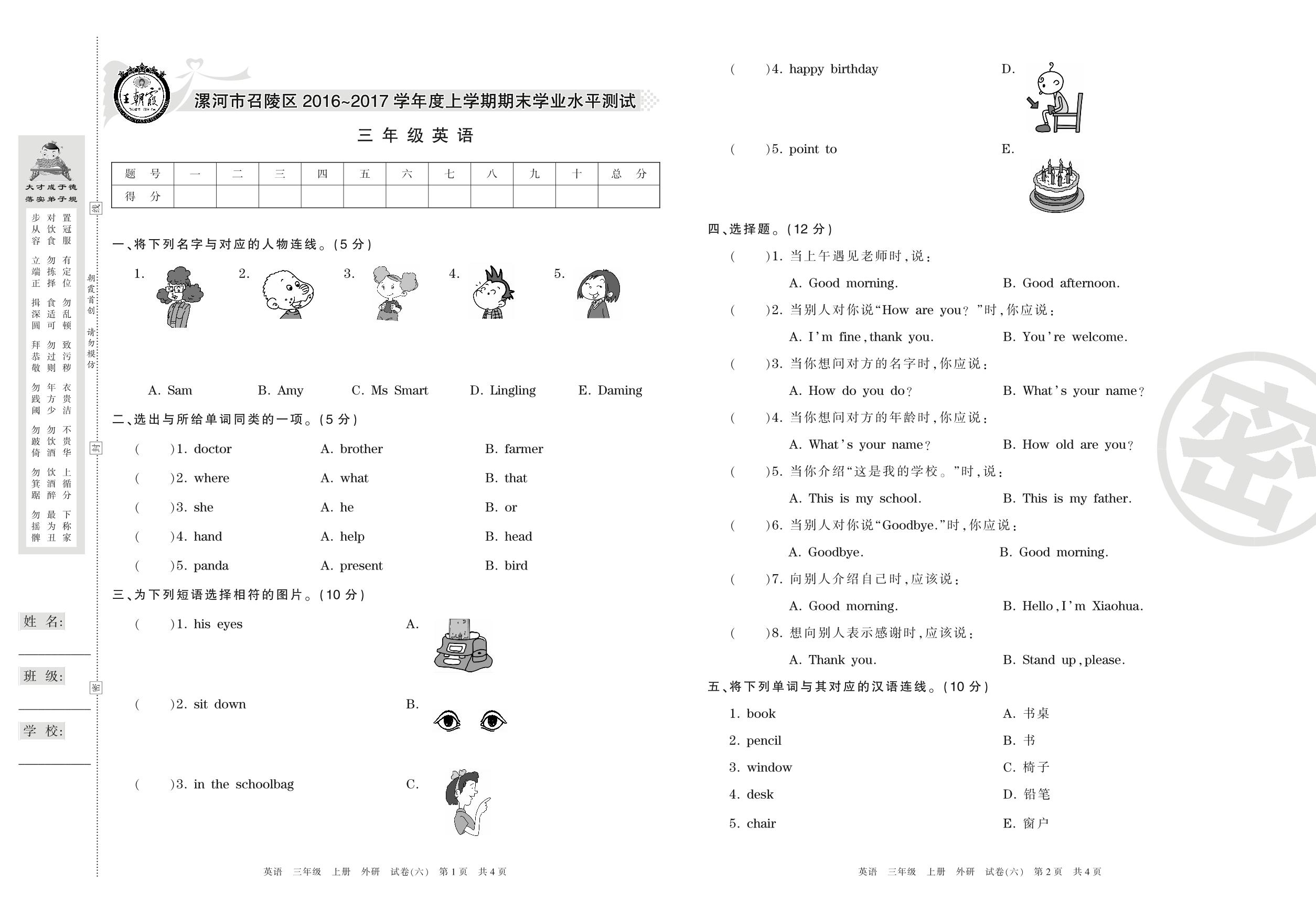 2016-2017学年第一学期漯河市召陵区三年级英语试卷(外研版)【6】