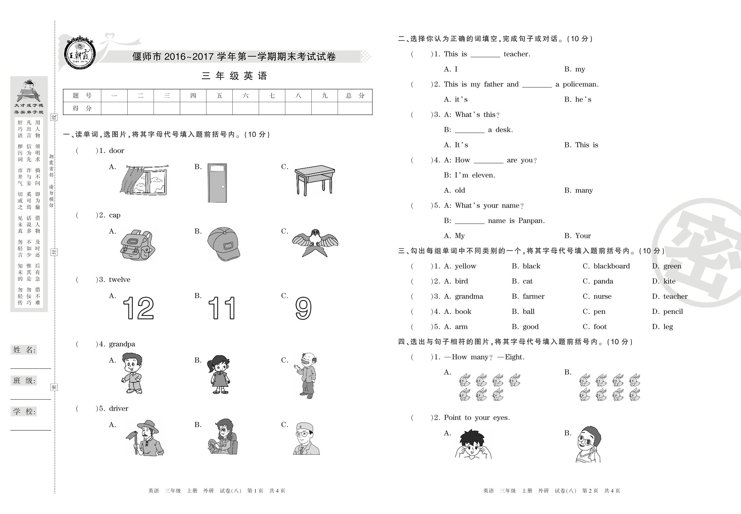 2016-2017学年第一学期偃师市三年级英语试卷(外研版)【8】