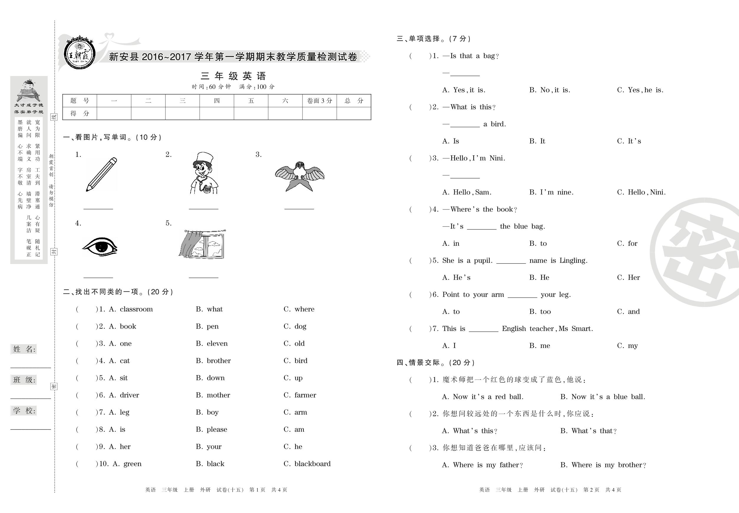2016-2017学年第一学期新安县三年级英语试卷(外研版)【15】