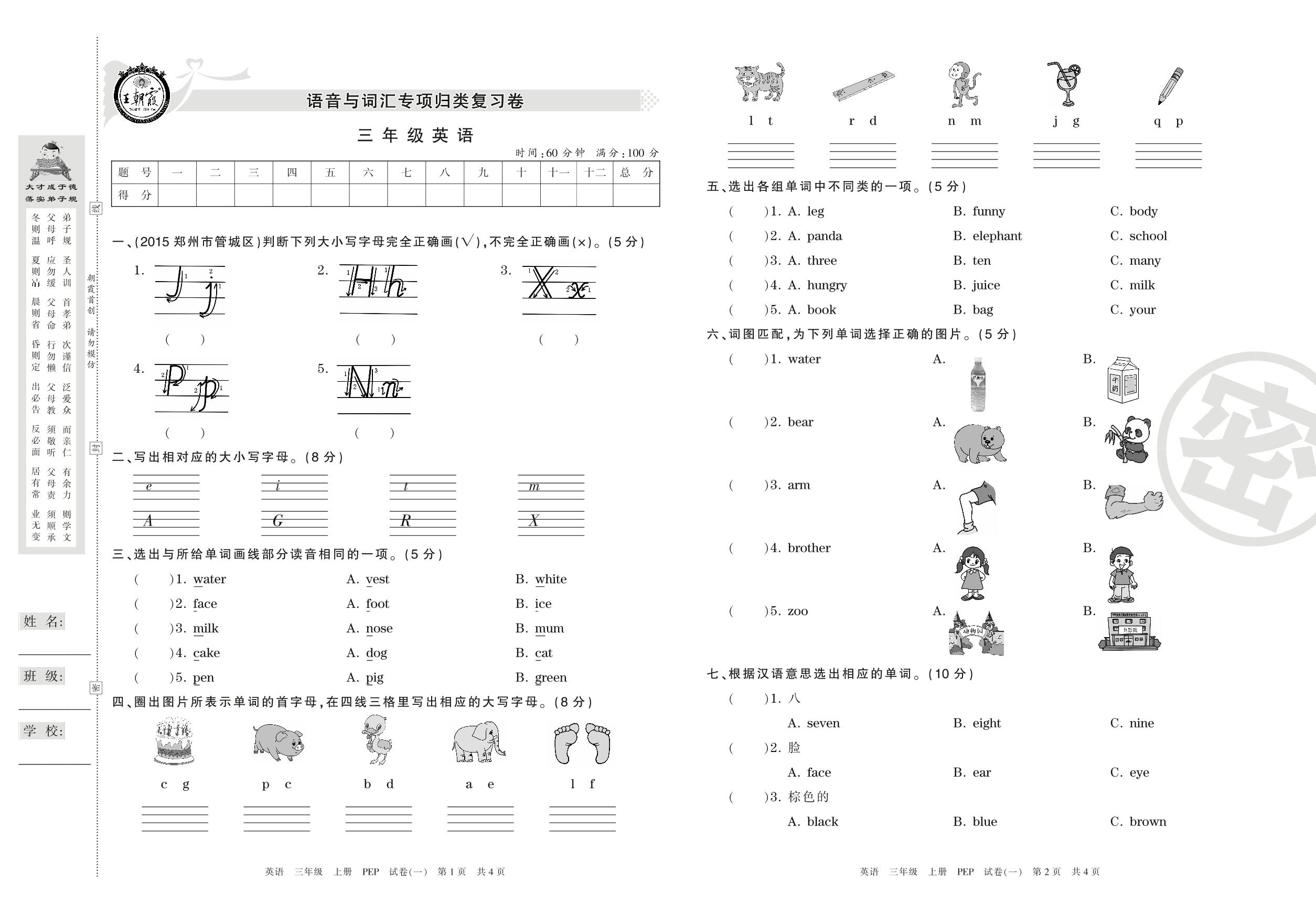 三年级英语人教PEP版(三起始)上册专项卷