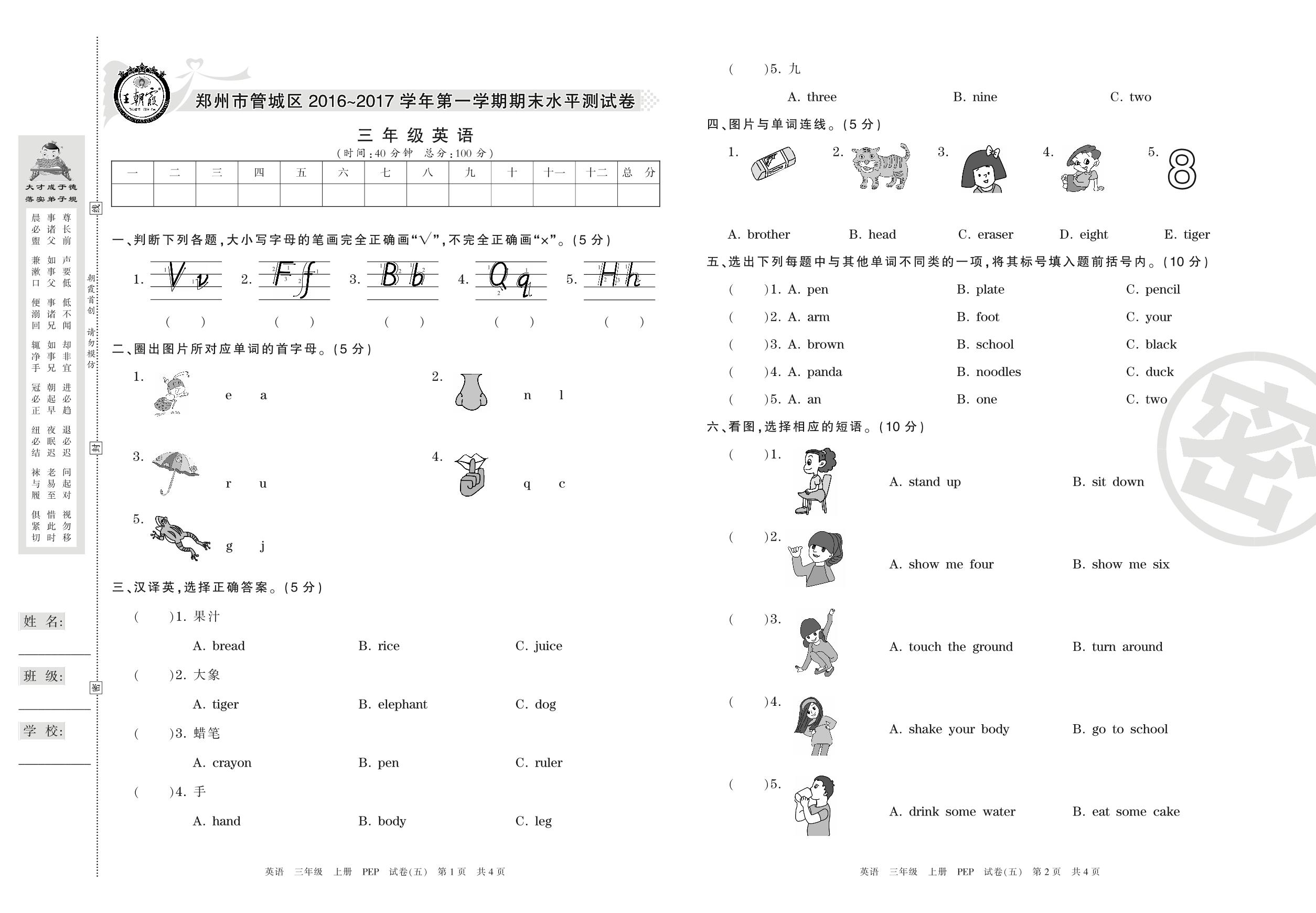 2016-2017学年第一学期郑州市管城区三年级英语试卷(PEP版)【5】