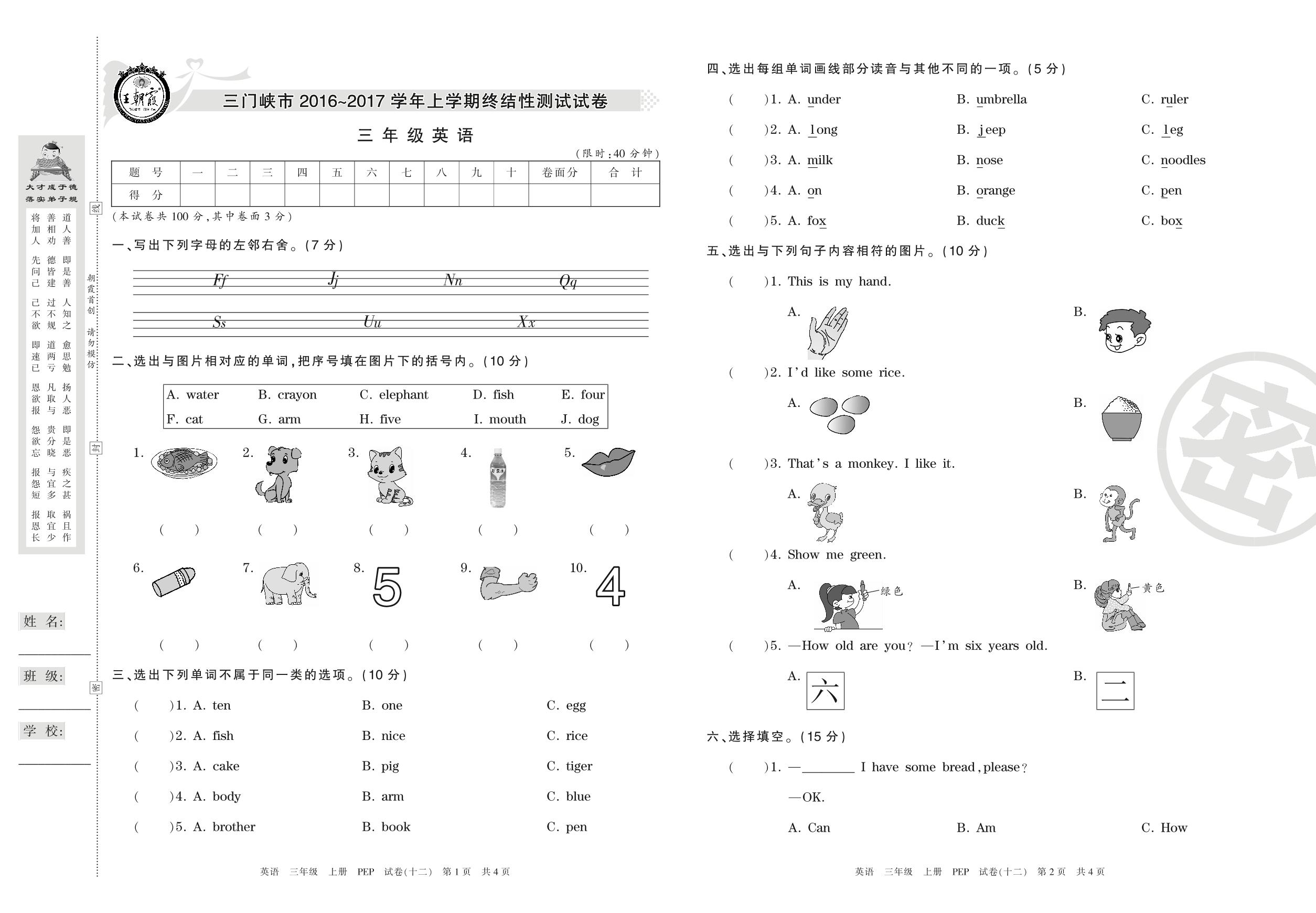 2016-2017学年第一学期三门峡市三年级英语试卷(PEP版)【12】