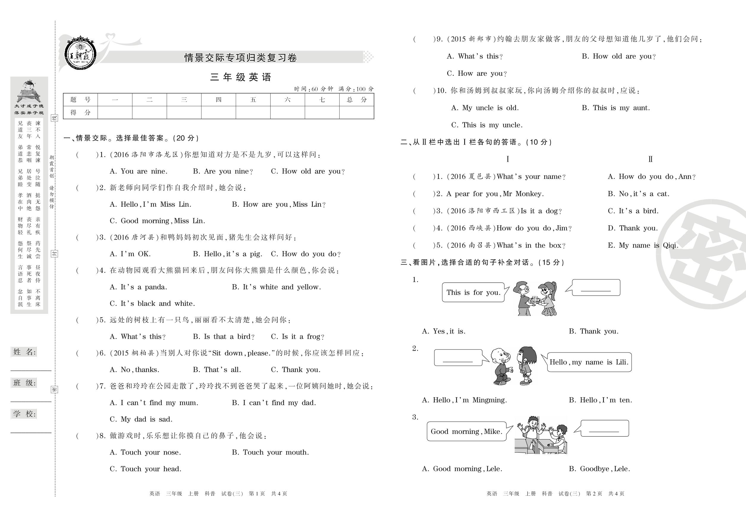 三年级英语科普版上册专项卷