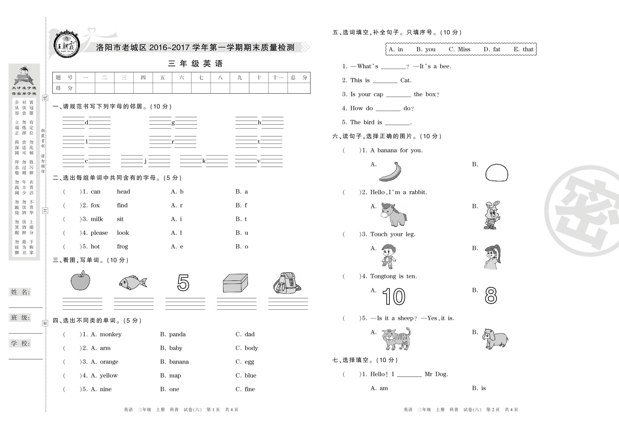 2016-2017学年第一学期洛阳市老城区三年级英语试卷(科普版)【6】
