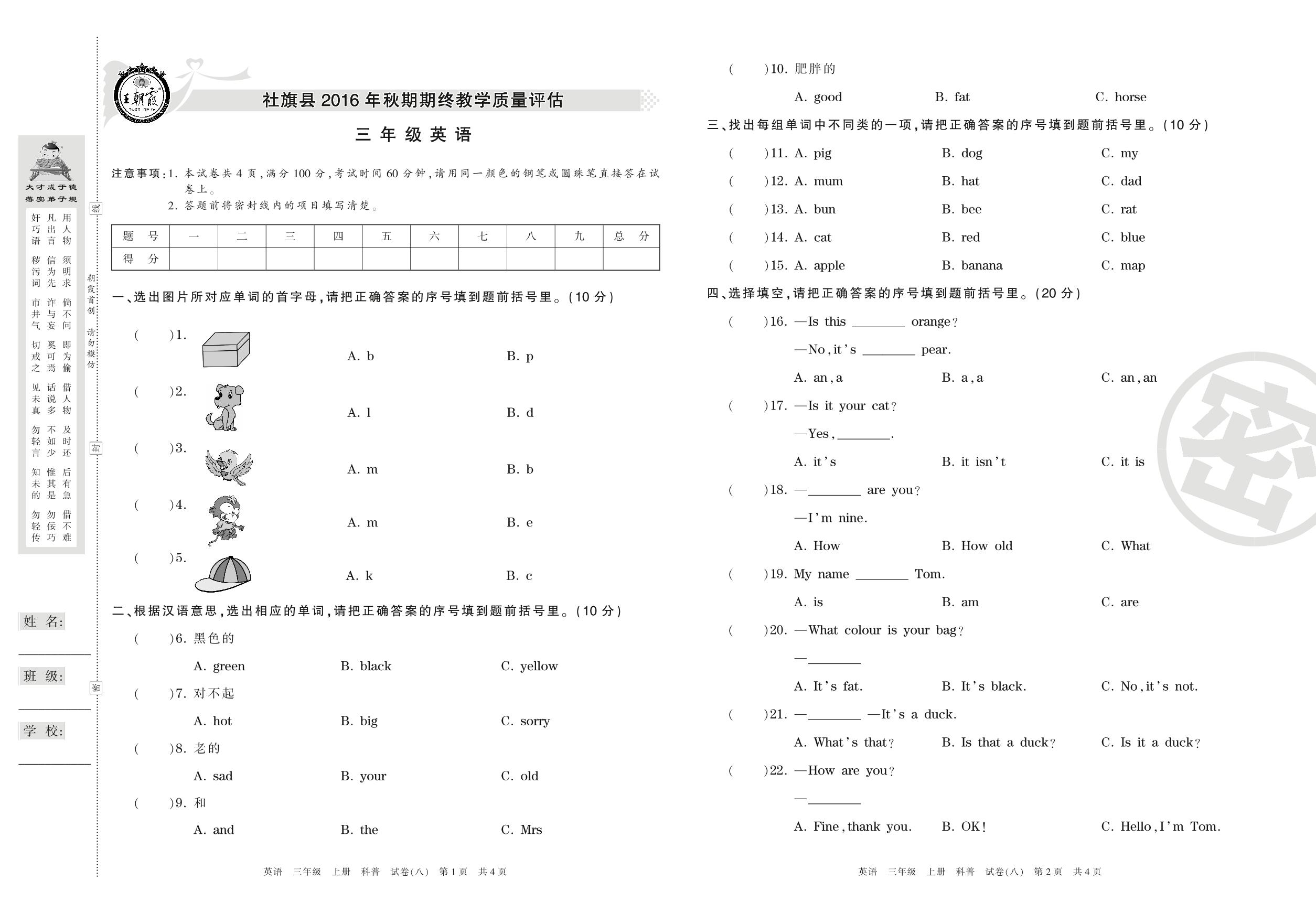 2016-2017学年第一学期南阳市社旗县三年级英语试卷(科普版)【8】