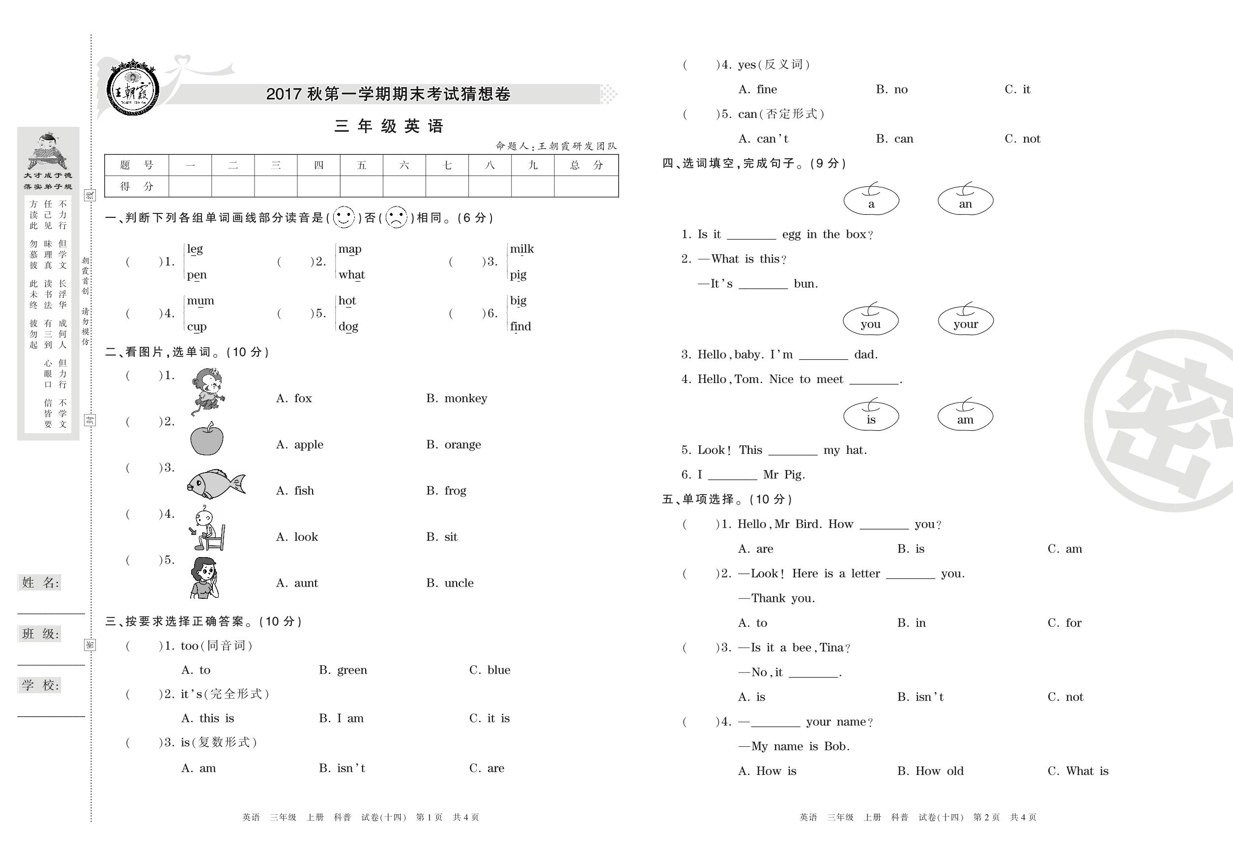 王朝霞期末猜想卷三年级上册英语(科普版)【14】