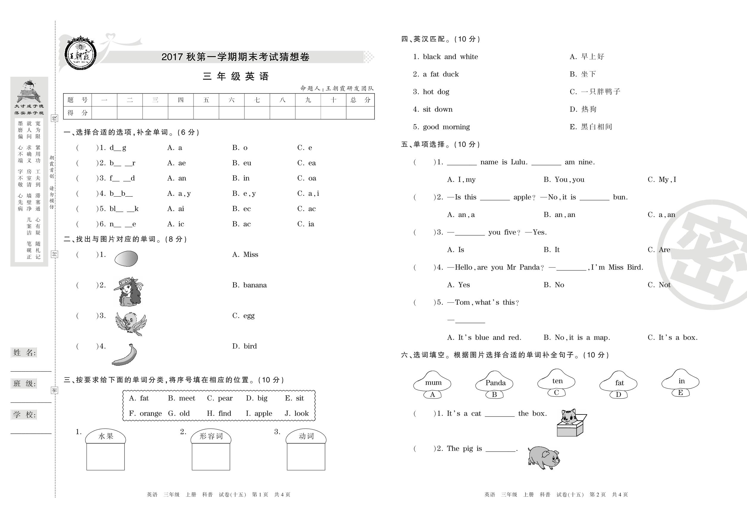 王朝霞期末猜想卷三年级上册英语(科普版)【15】