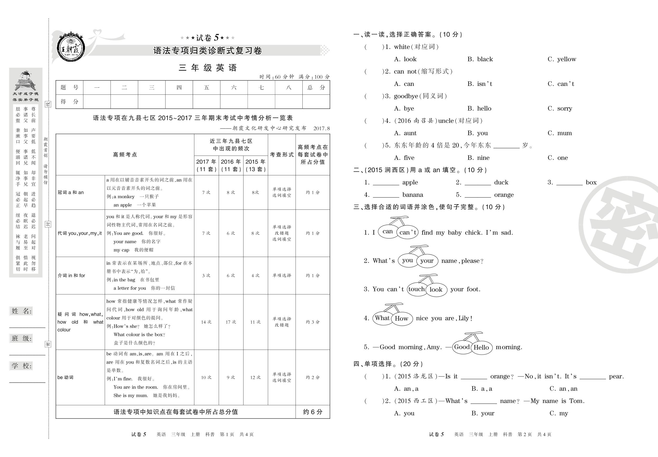 王朝霞期末专项卷三年级上册英语(科普版)【5】