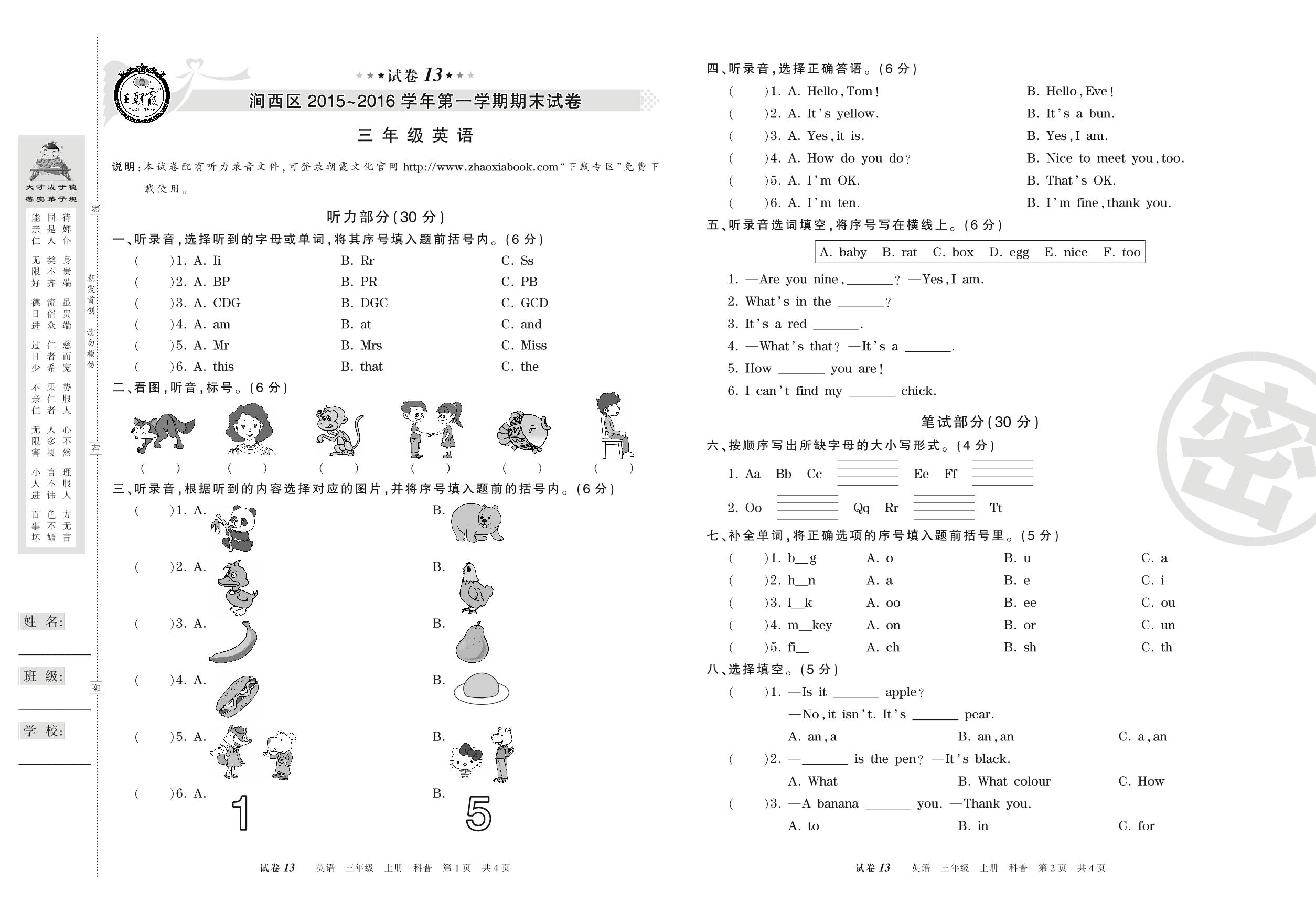 2015-2016学年第一学期洛阳市涧西区三年级英语试卷(科普版)【13】