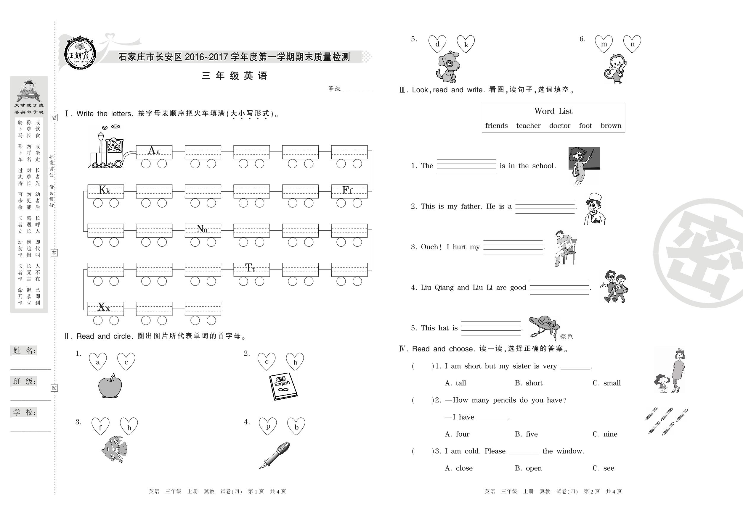 2016-2017学年第一学期石家庄市长安区三年级英语试卷(冀教版)【4】