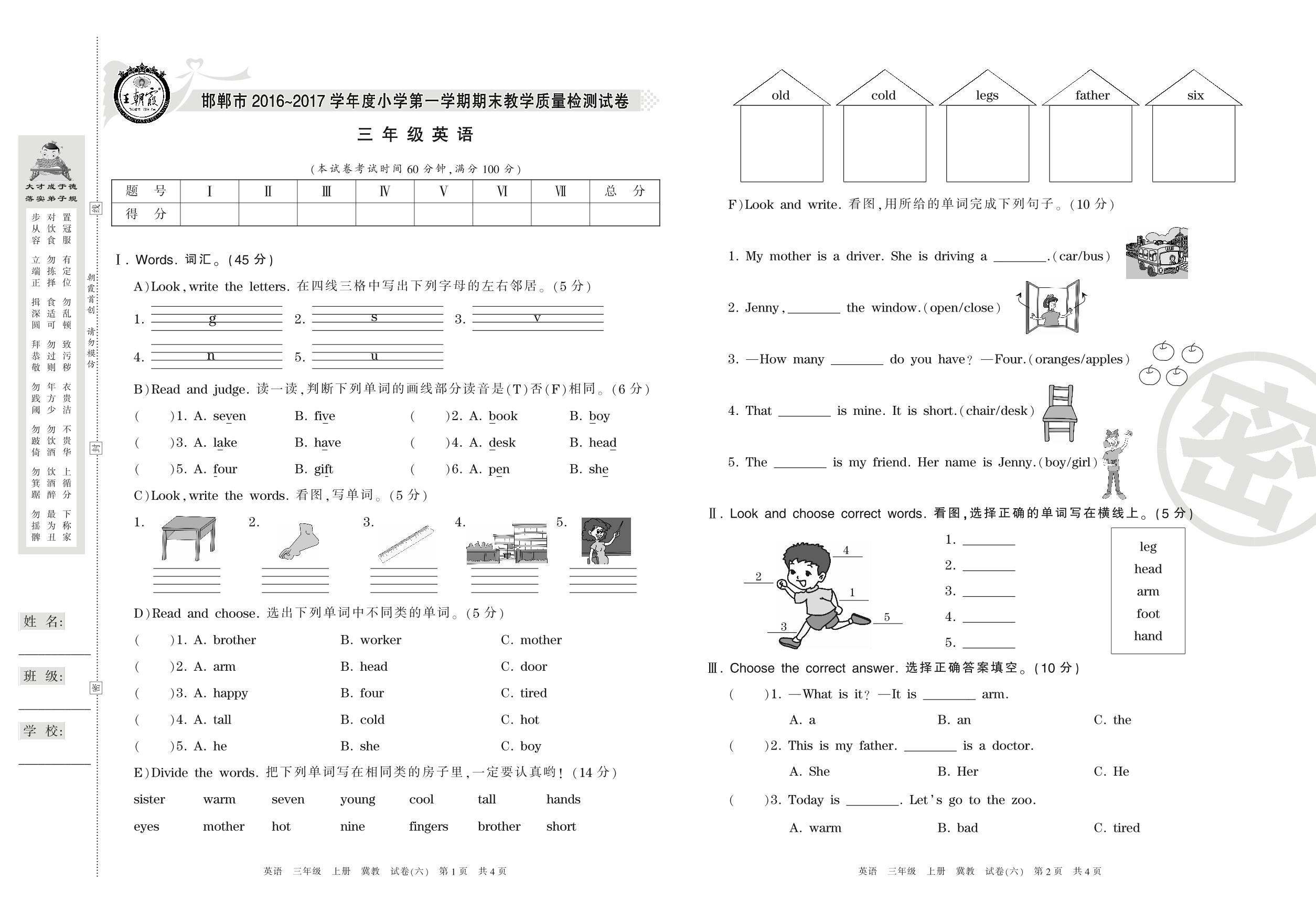 2016-2017学年第一学期邯郸市三年级英语试卷(冀教版)【6】
