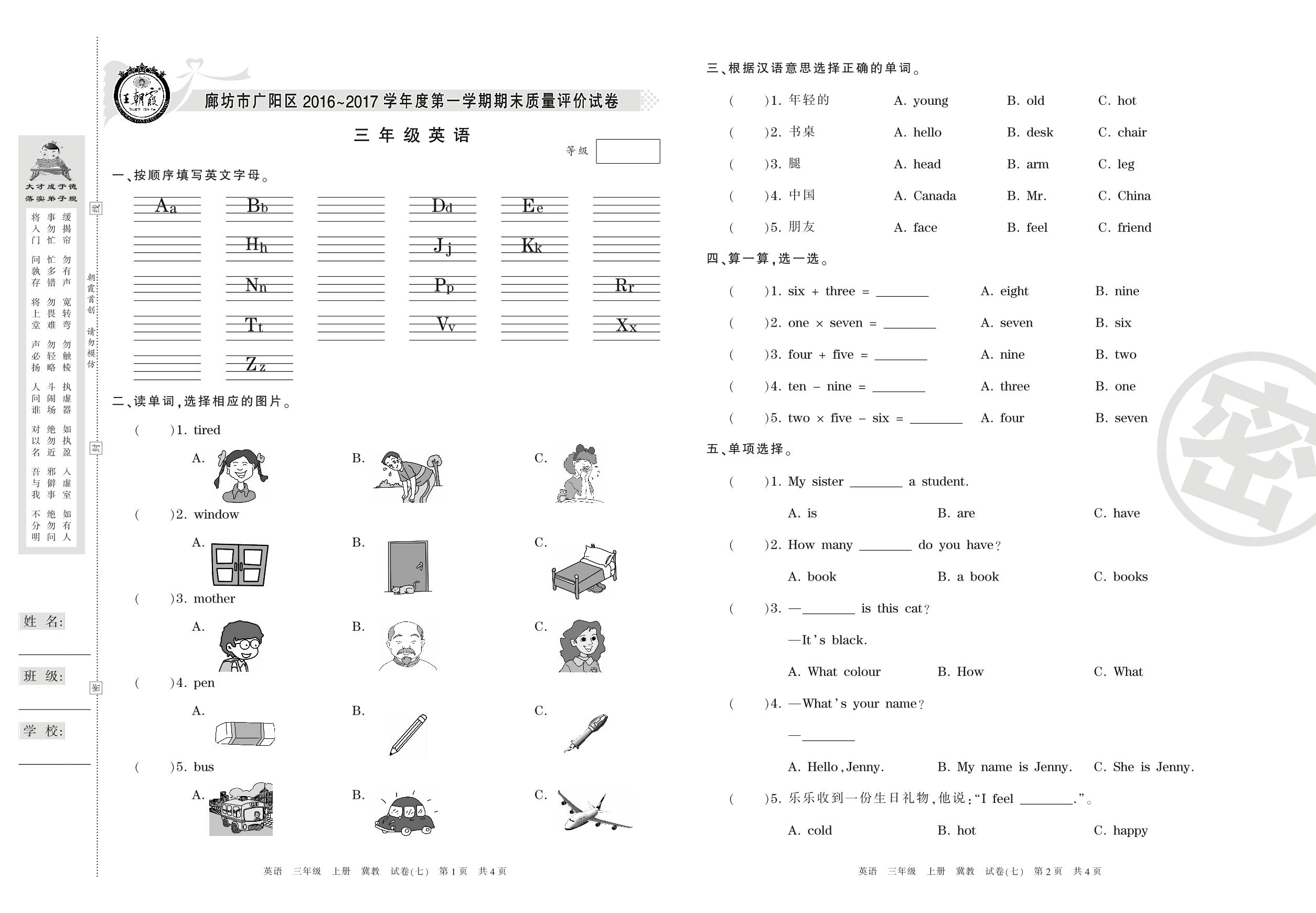 2016-2017学年第一学期廊坊市广阳区三年级英语试卷(冀教版)【7】