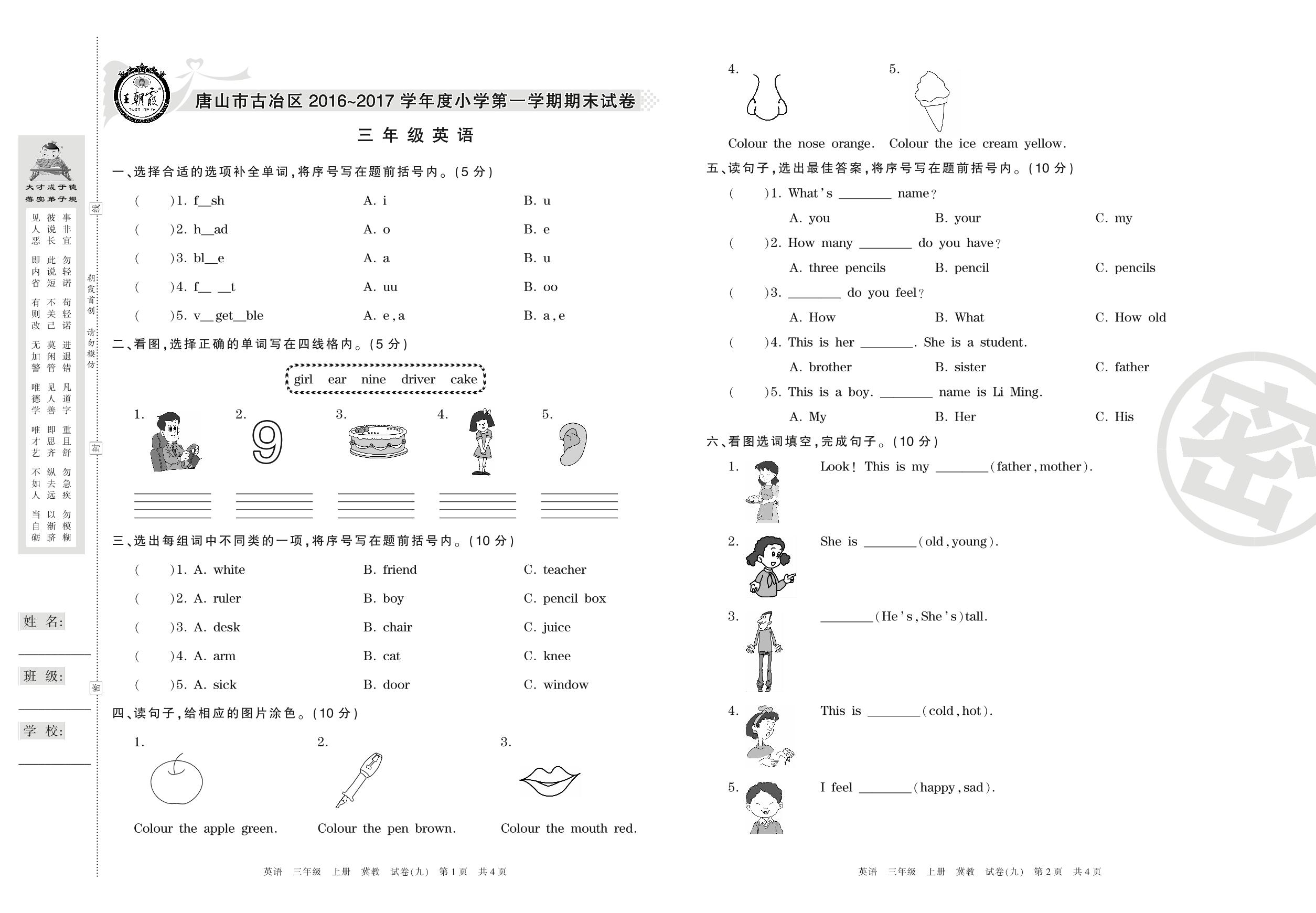 2016-2017学年第一学期唐山市古冶区三年级英语试卷(冀教版)【9】