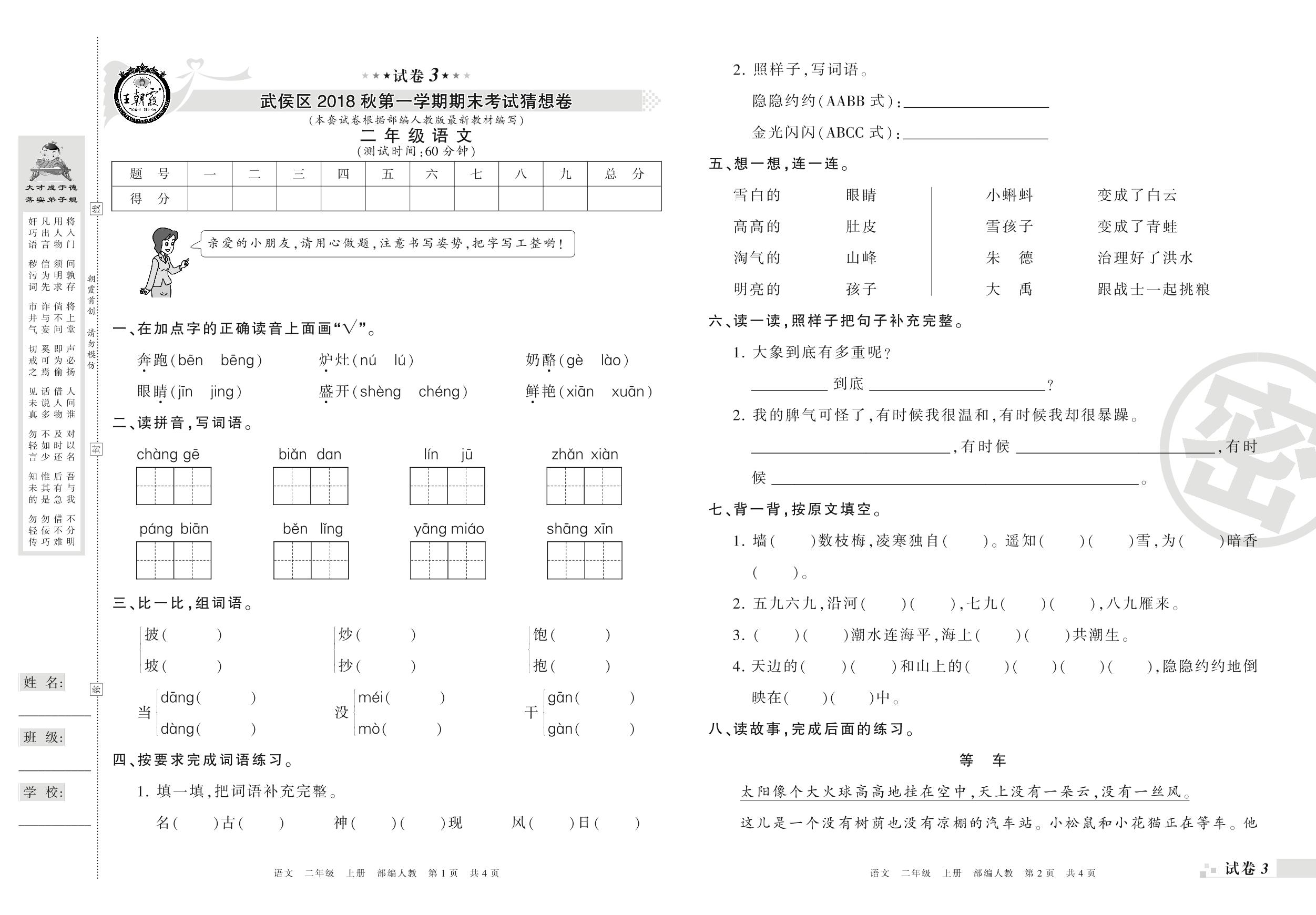 2018-2019学年第一学期成都市武侯区二年级语文试卷(人教版)_R21080180735【3】