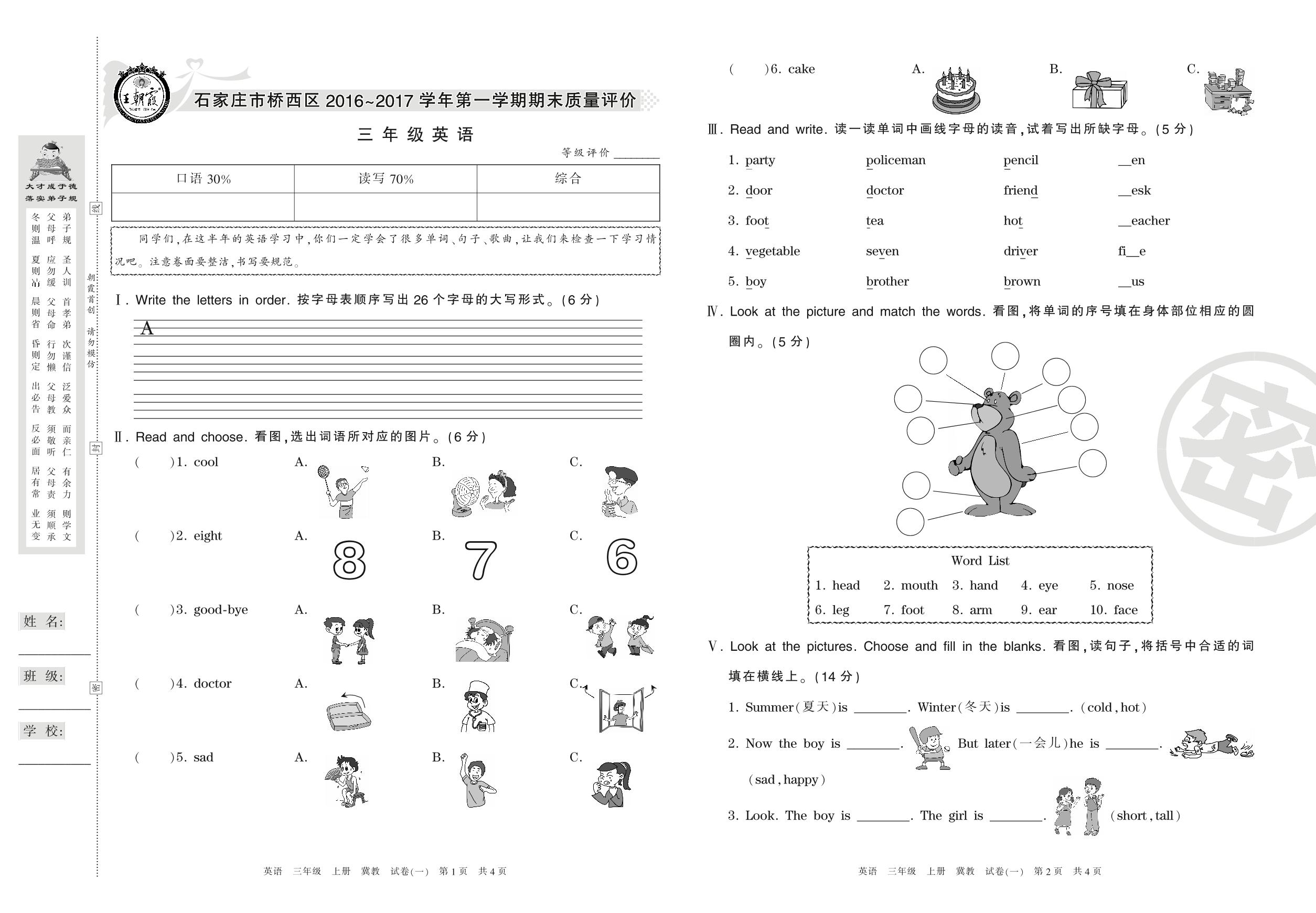 2016-2017学年第一学期石家庄市桥西区三年级英语试卷(冀教版)【1】