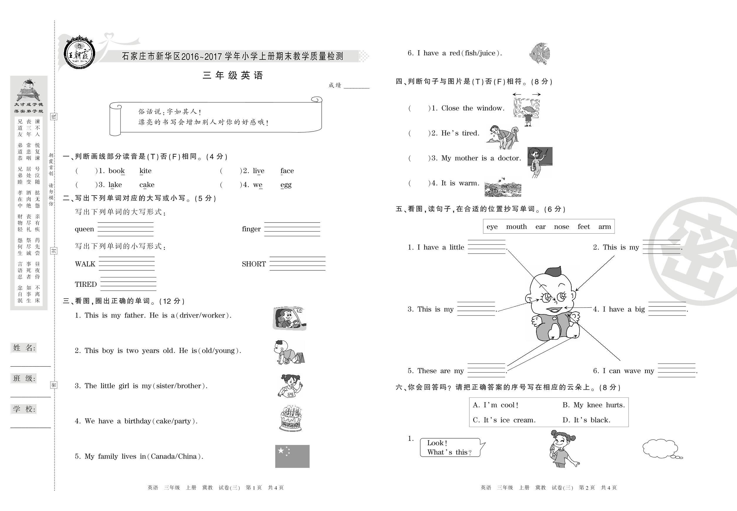 2016-2017学年第一学期石家庄市新华区三年级英语试卷(冀教版)【3】