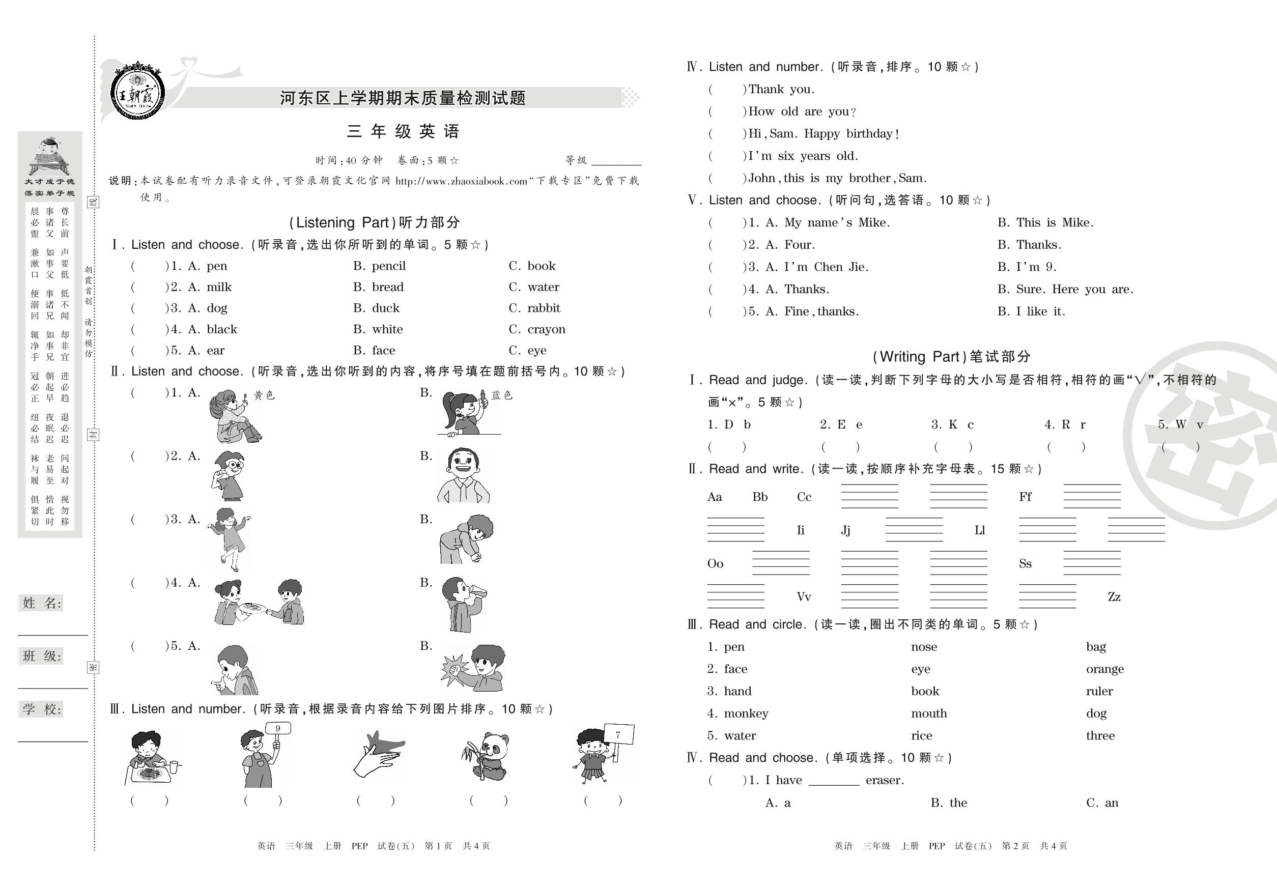 三年级英语人教PEP版(三起始)上册期末卷