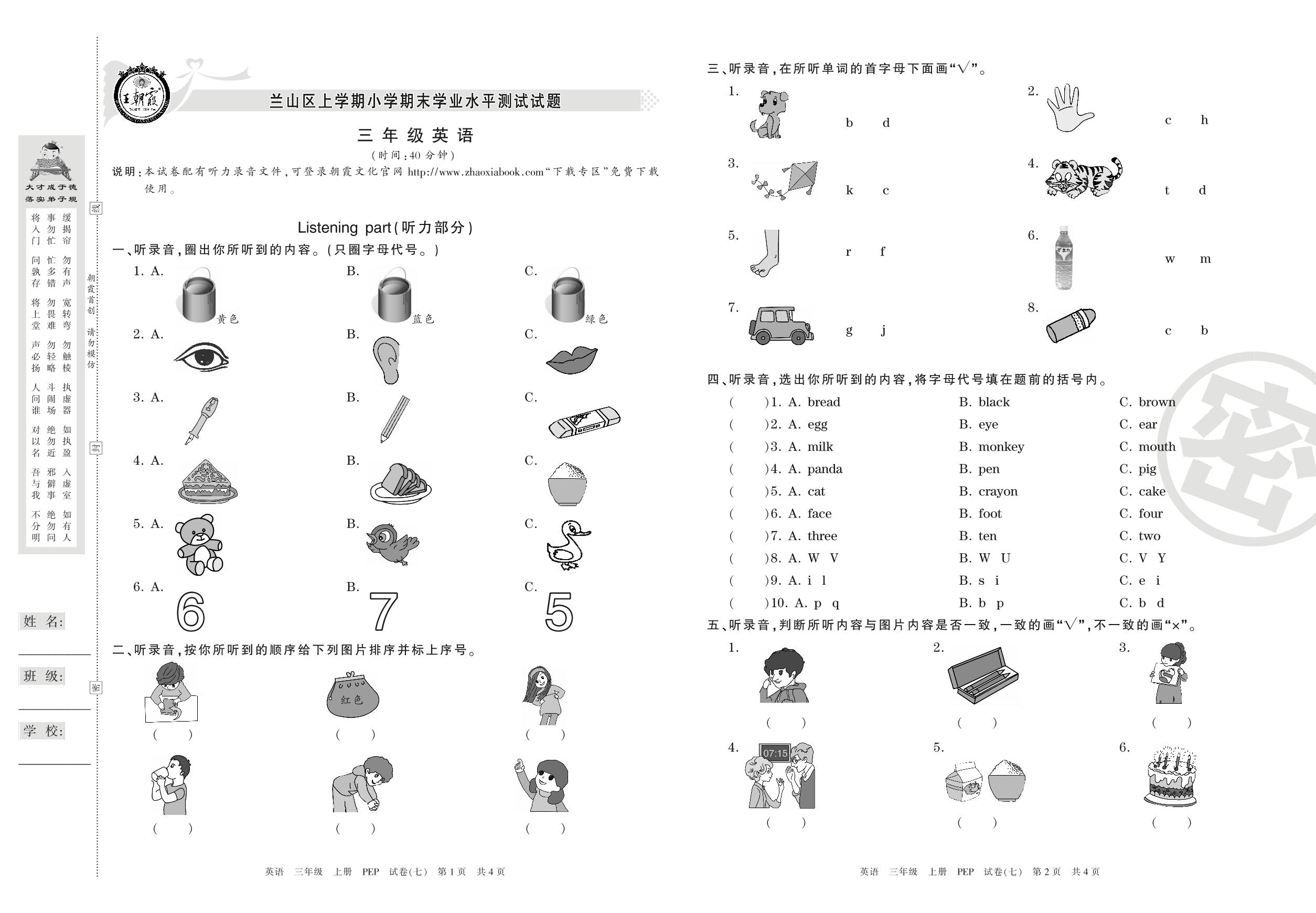 2016-2017学年第一学期临沂市兰山区三年级英语试卷(PEP版)【7】