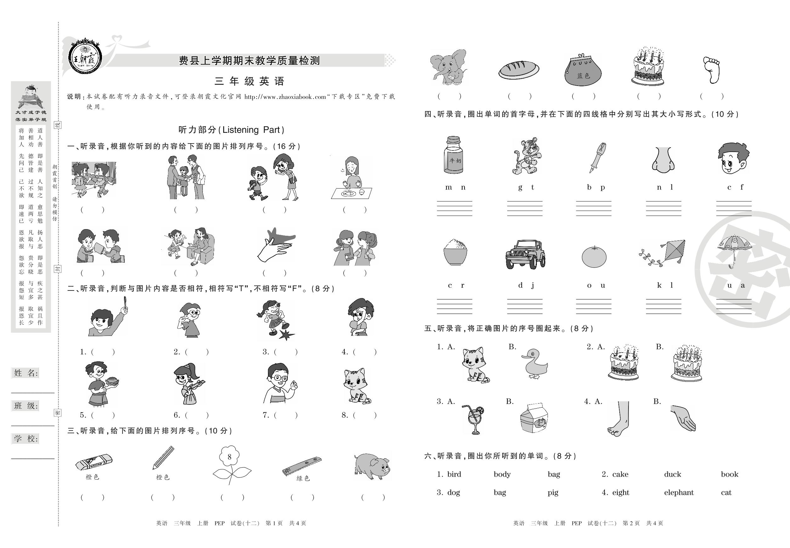 三年级英语人教PEP版(三起始)上册期末卷
