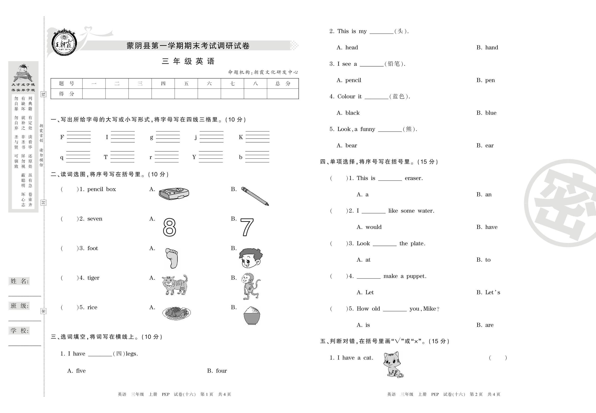 三年级英语人教PEP版(三起始)上册期末卷