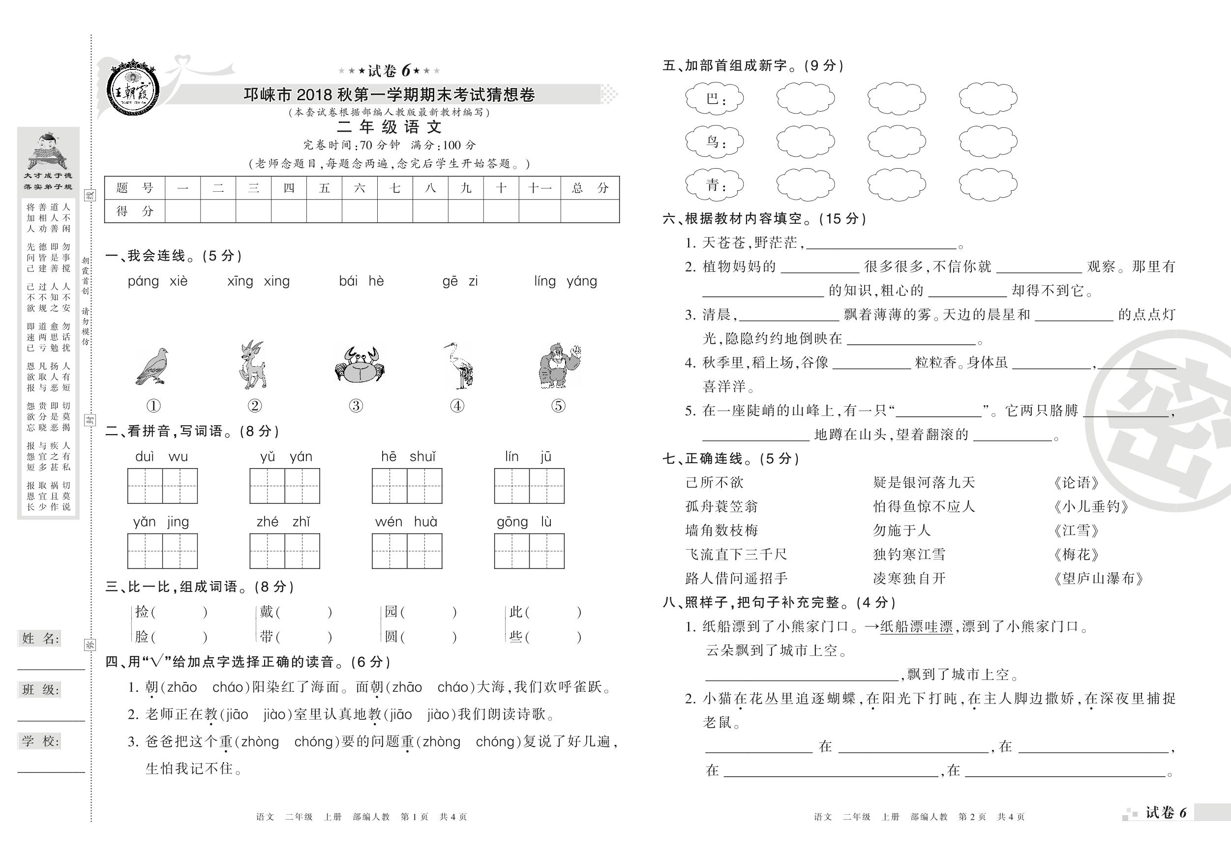 2017-2018学年第一学期邛崃市二年级语文试卷(人教版)【6】