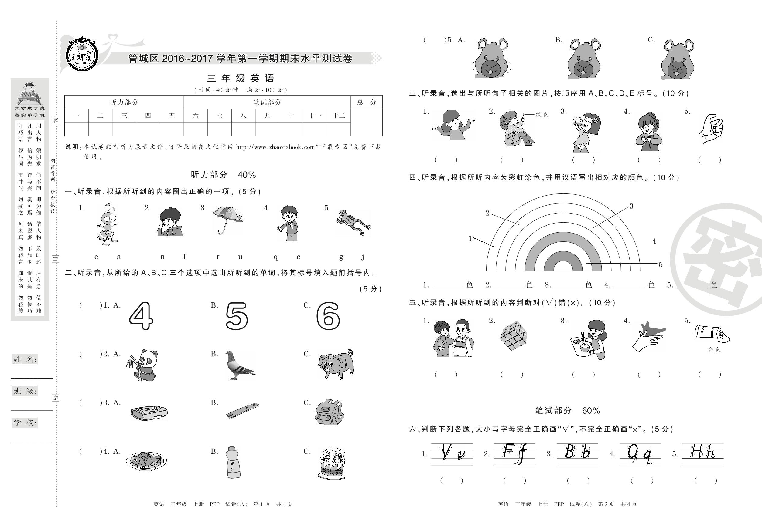 2016-2017学年第一学期郑州市管城区三年级英语试卷(PEP版)【8】