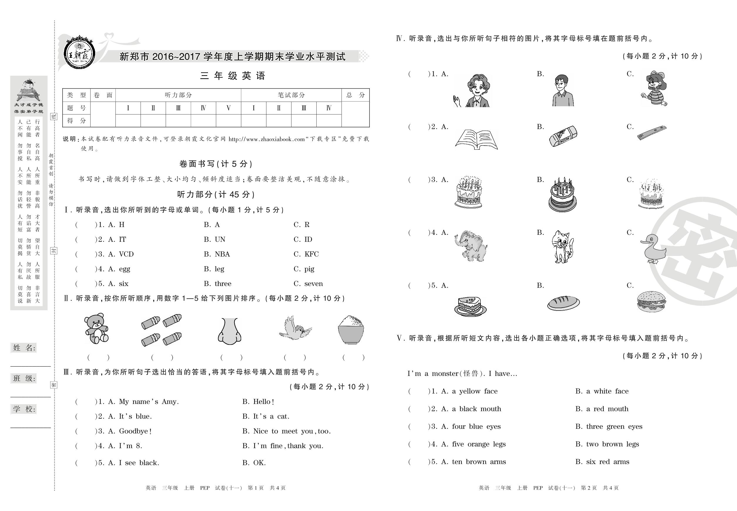 2016-2017学年第一学期新郑市三年级英语试卷(PEP版)【11】
