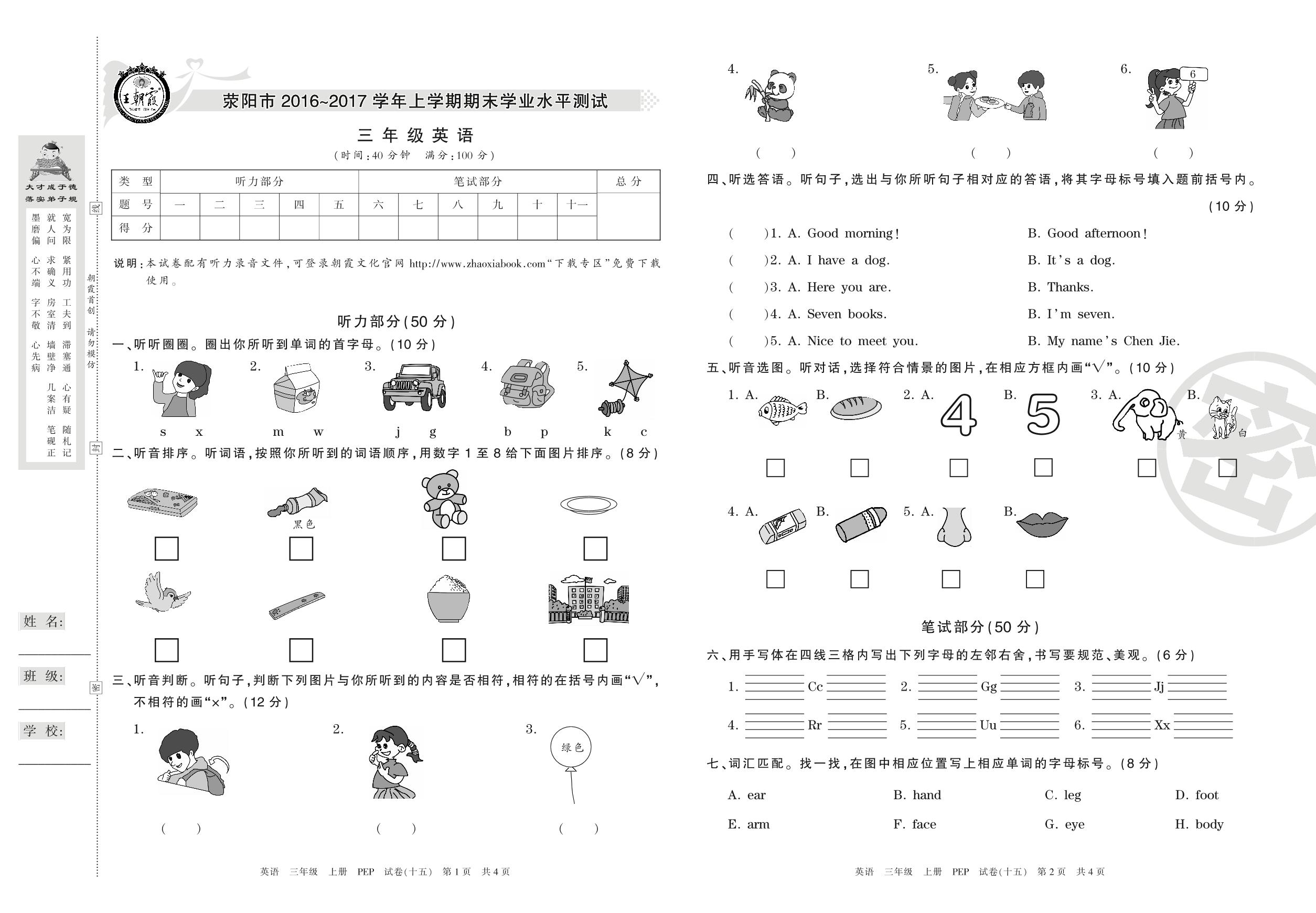 2016-2017学年第一学期荥阳市三年级英语试卷(PEP版)【15】