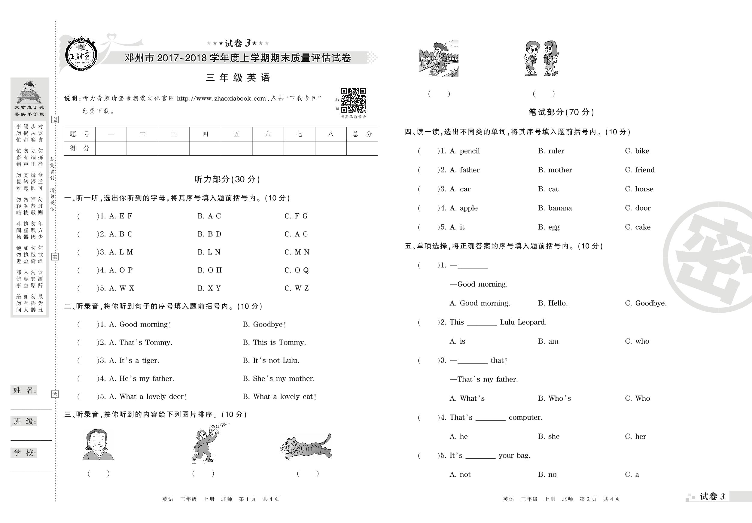 2017-2018学年第一学期邓州市三年级英语试卷(北师版)【3】