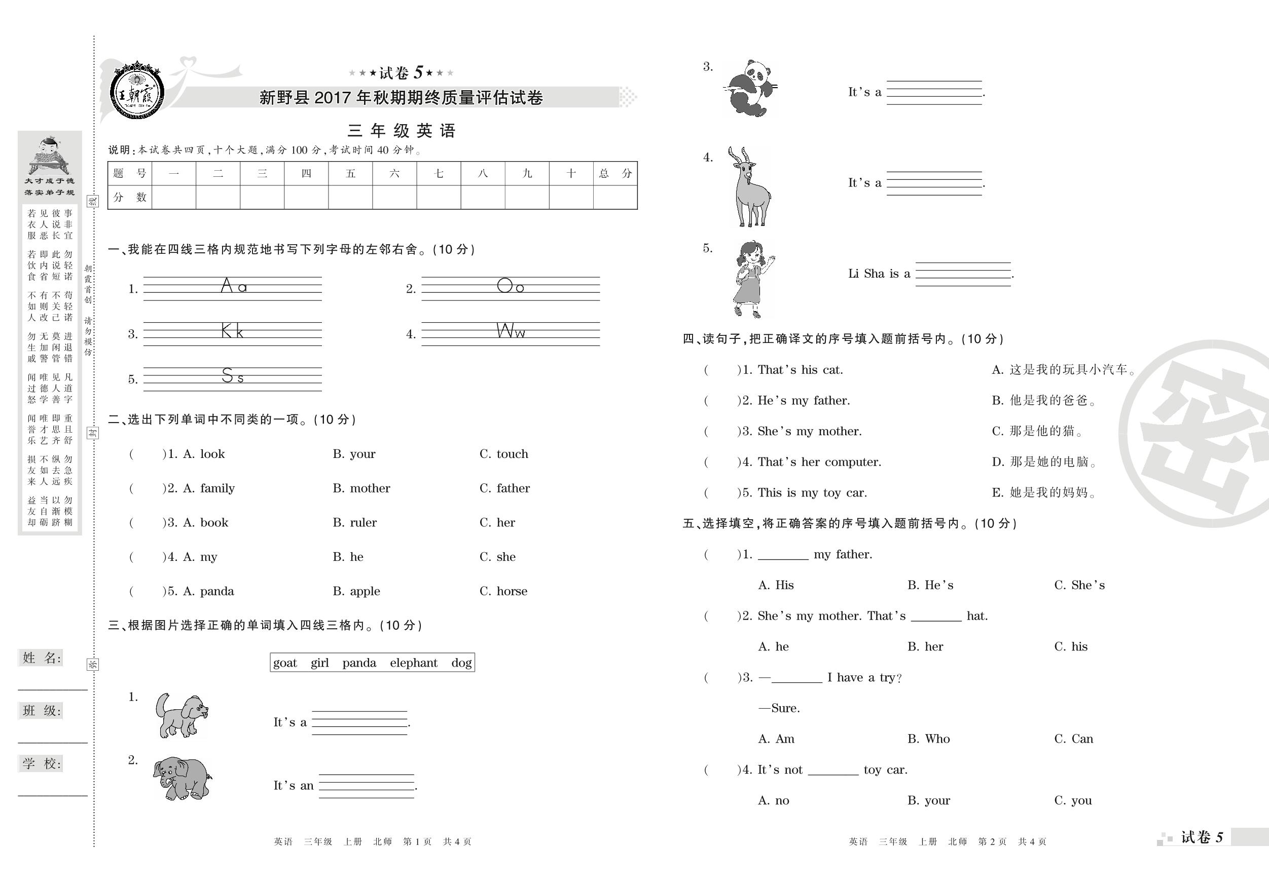 2017-2018学年第一学期南阳市新野县三年级英语试卷(北师版)【5】