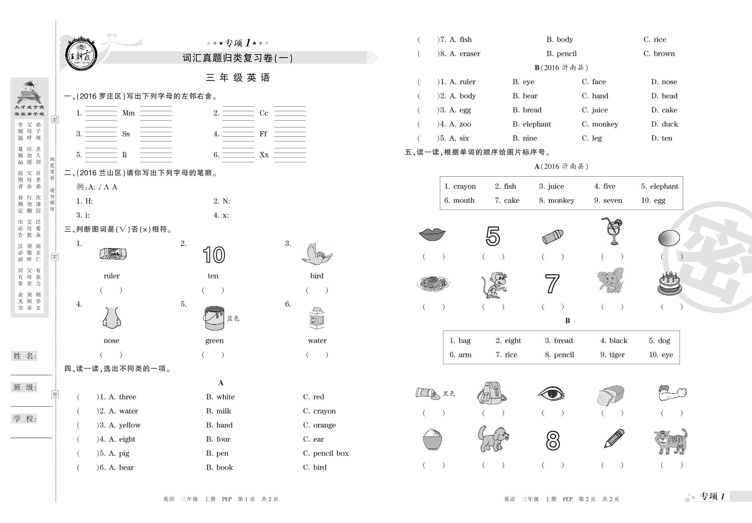 三年级英语人教PEP版(三起始)上册专项卷