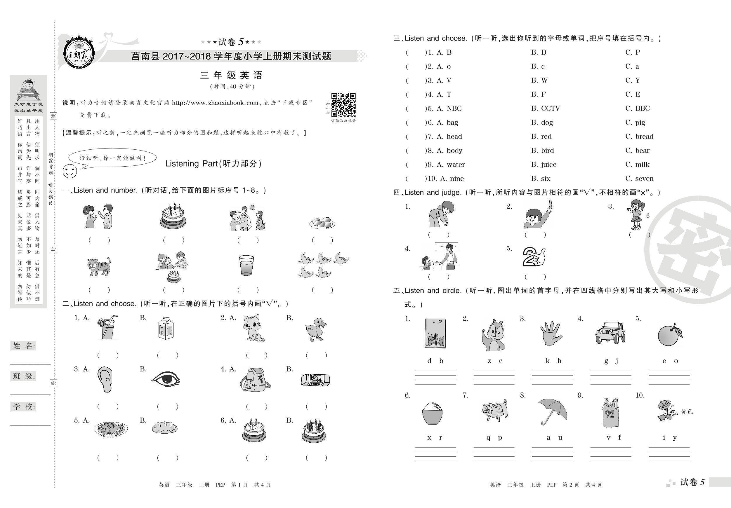 2017-2018学年第一学期临沂市莒南县三年级英语试卷(PEP版)【5】