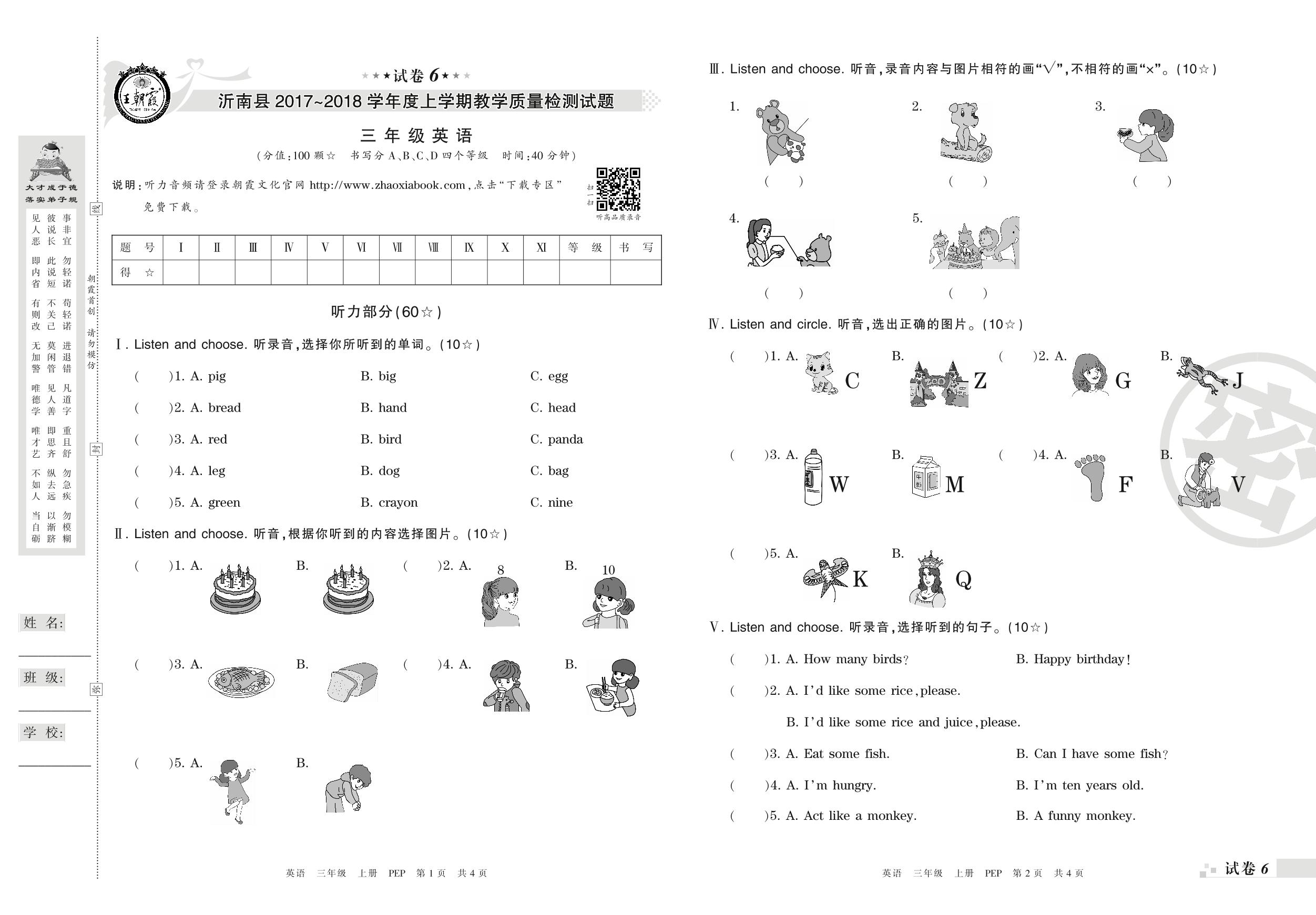 2017-2018学年第一学期临沂市沂南县三年级英语试卷(PEP版)【6】