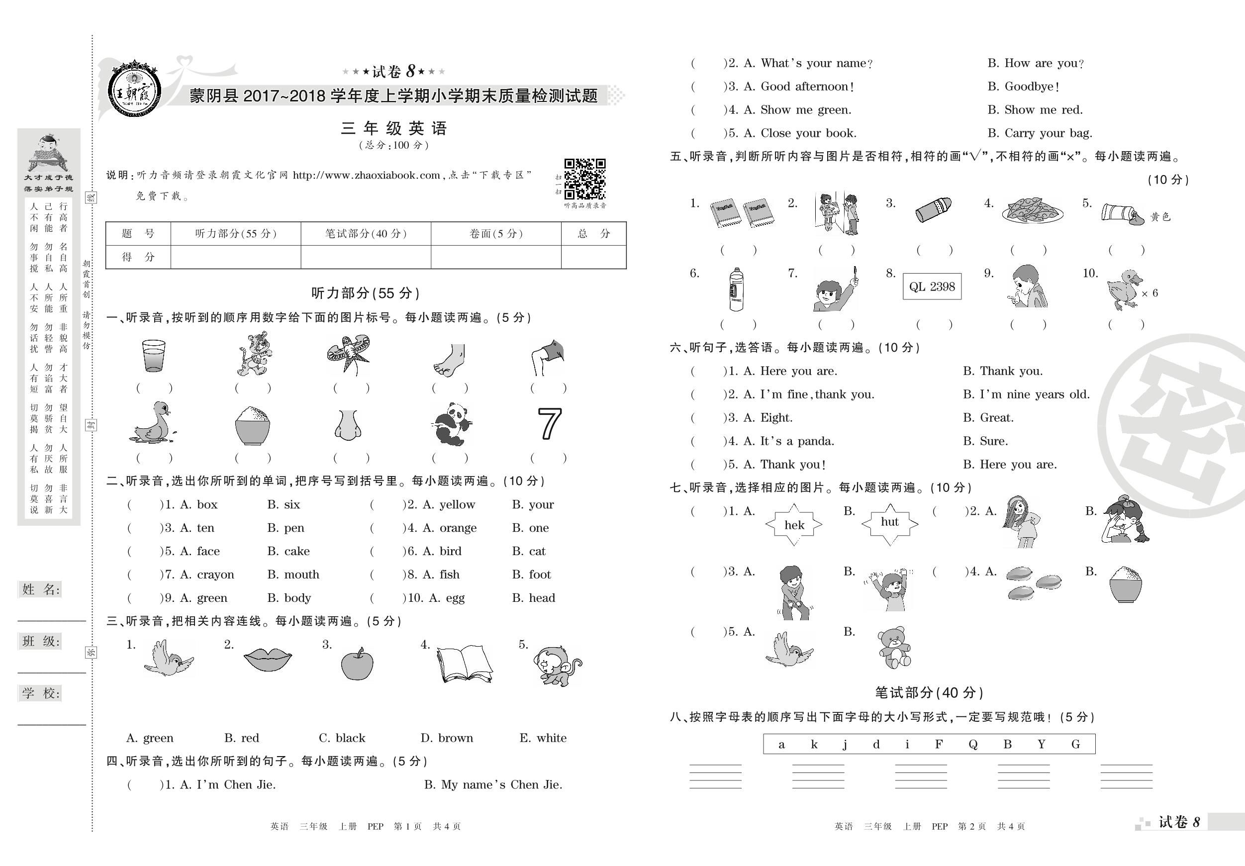 2017-2018学年第一学期临沂市蒙阴县三年级英语试卷(PEP版)【8】