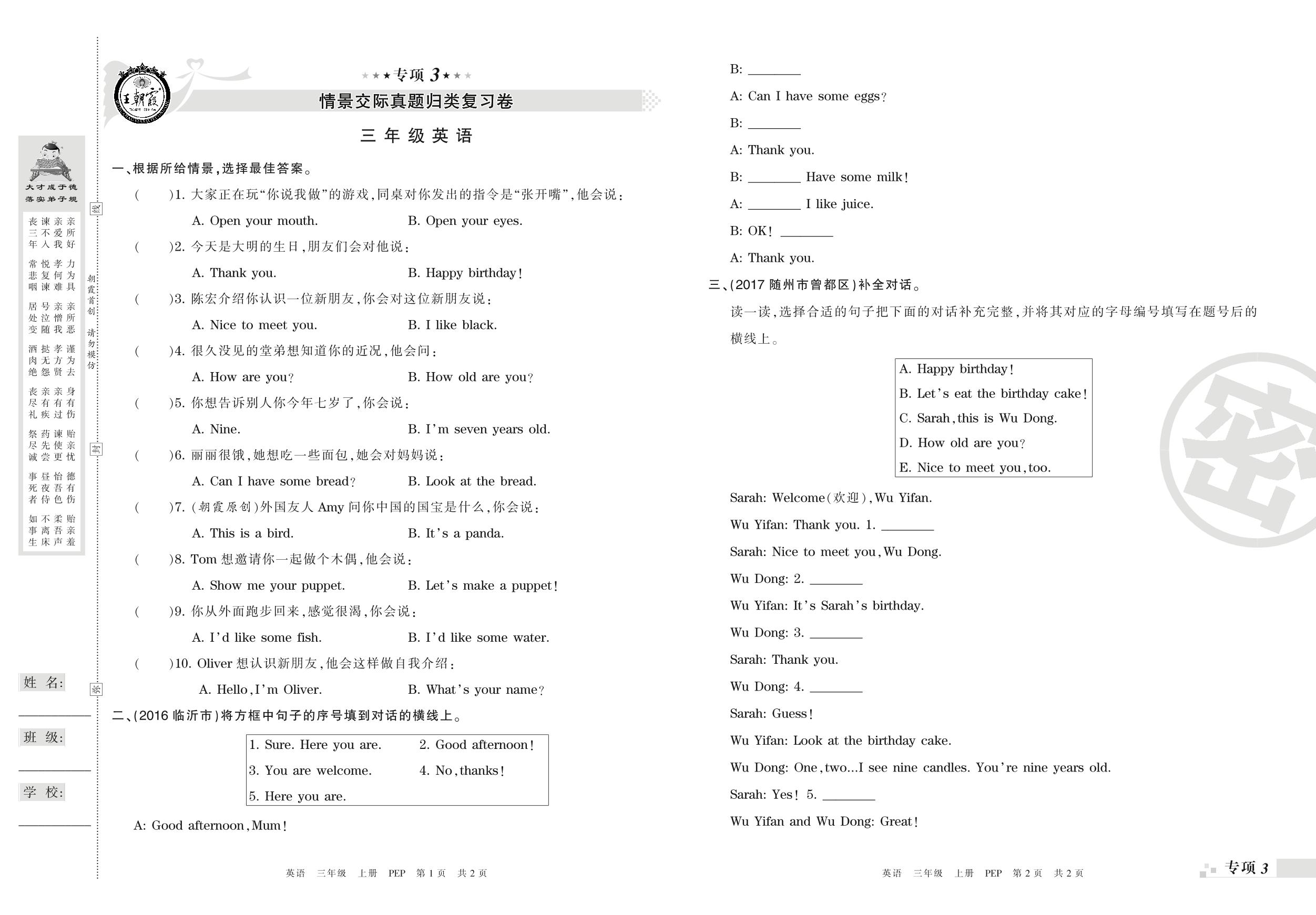 王朝霞期末专项卷——情景交际、阅读理解真题归类复习三年级上册英语(PEP版)_R210806194231【0】