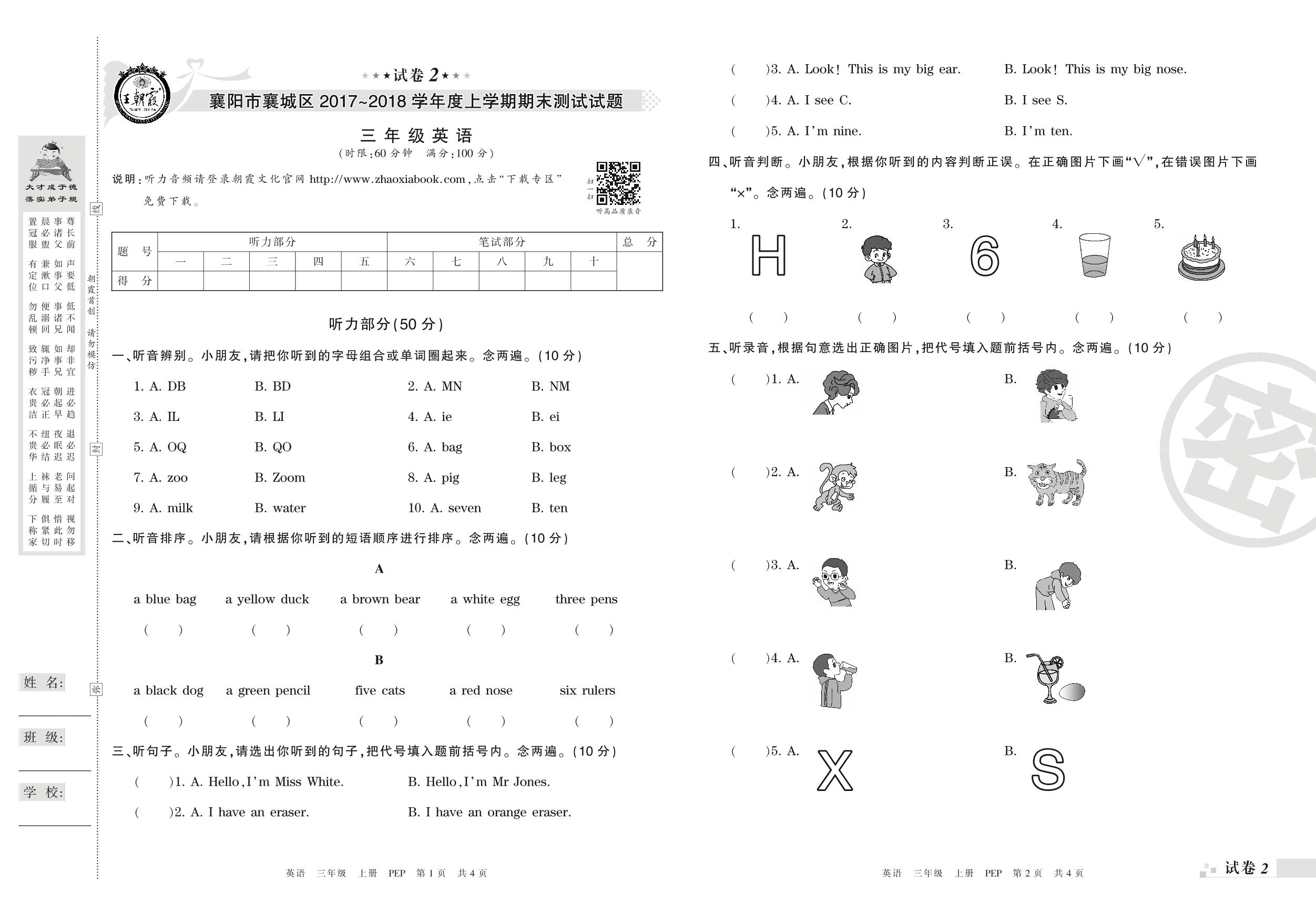 2017-2018学年第一学期襄阳市襄城区三年级英语试卷(PEP版)【2】