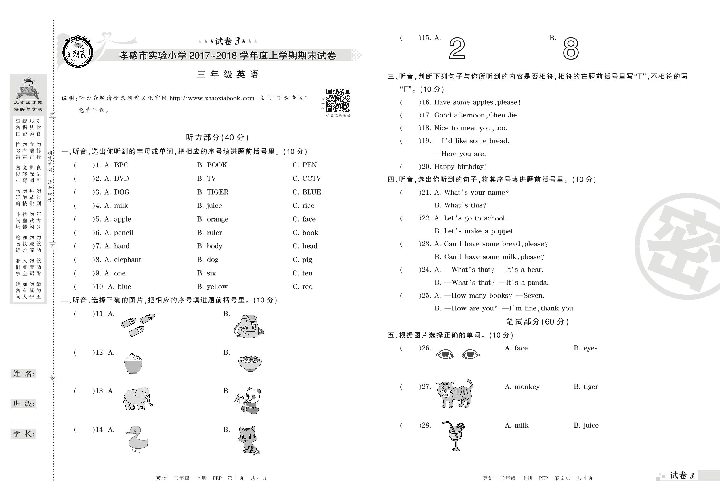 2017-2018学年第一学期孝感市实验小学三年级英语试卷(PEP版)【3】