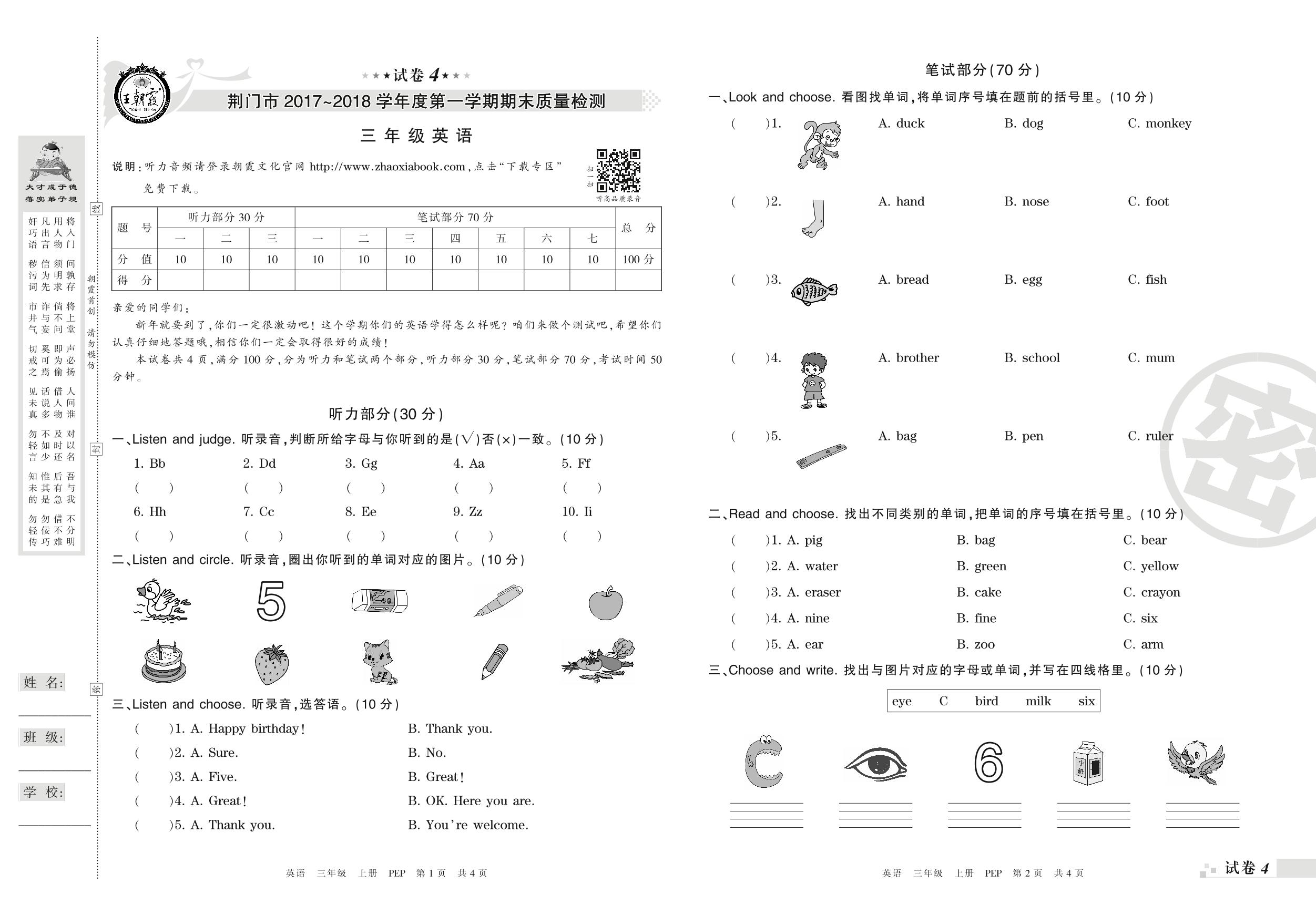 2017-2018学年第一学期荆门市三年级英语试卷(PEP版)【4】