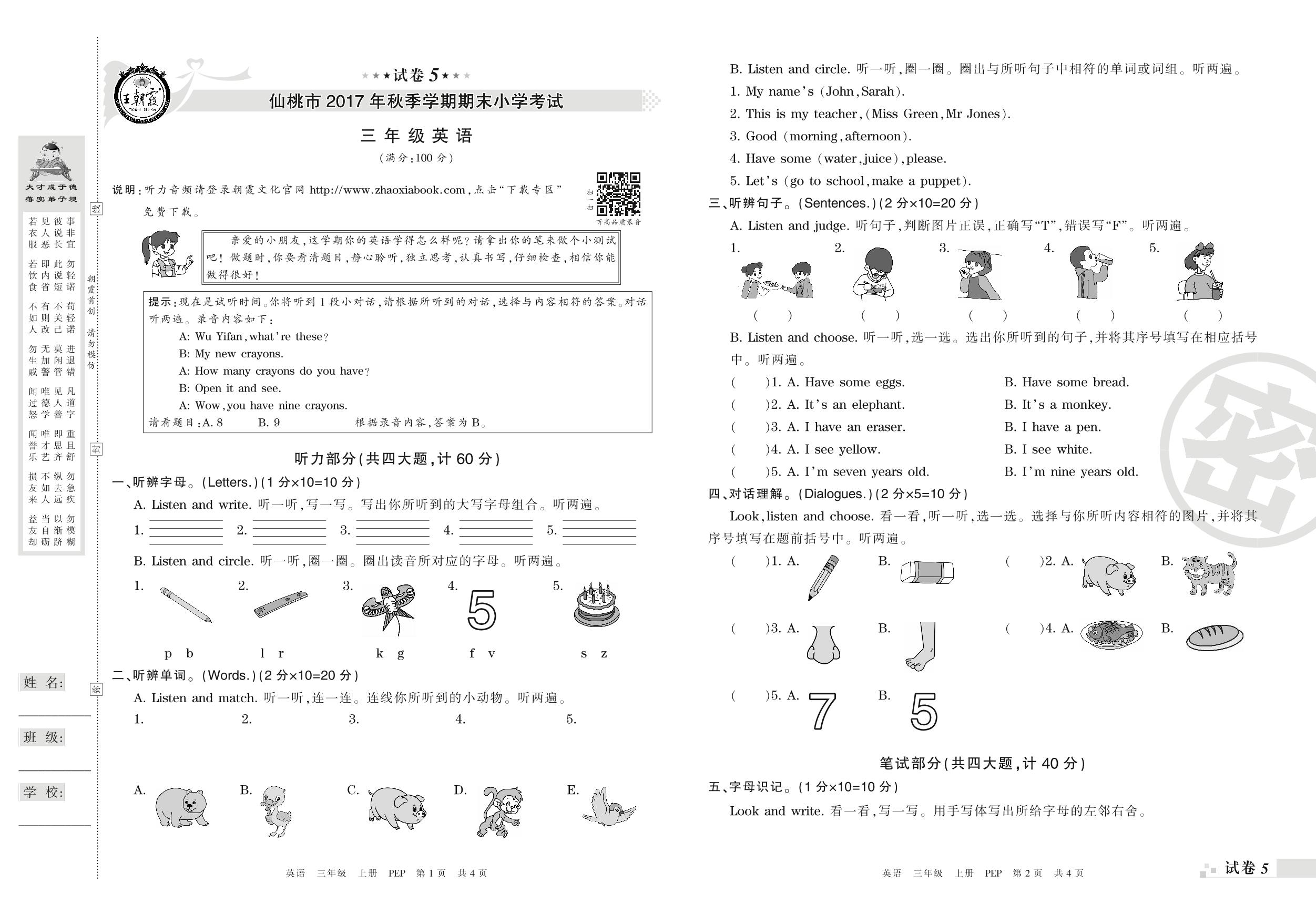 2017-2018学年第一学期仙桃市三年级英语试卷(PEP版)【5】