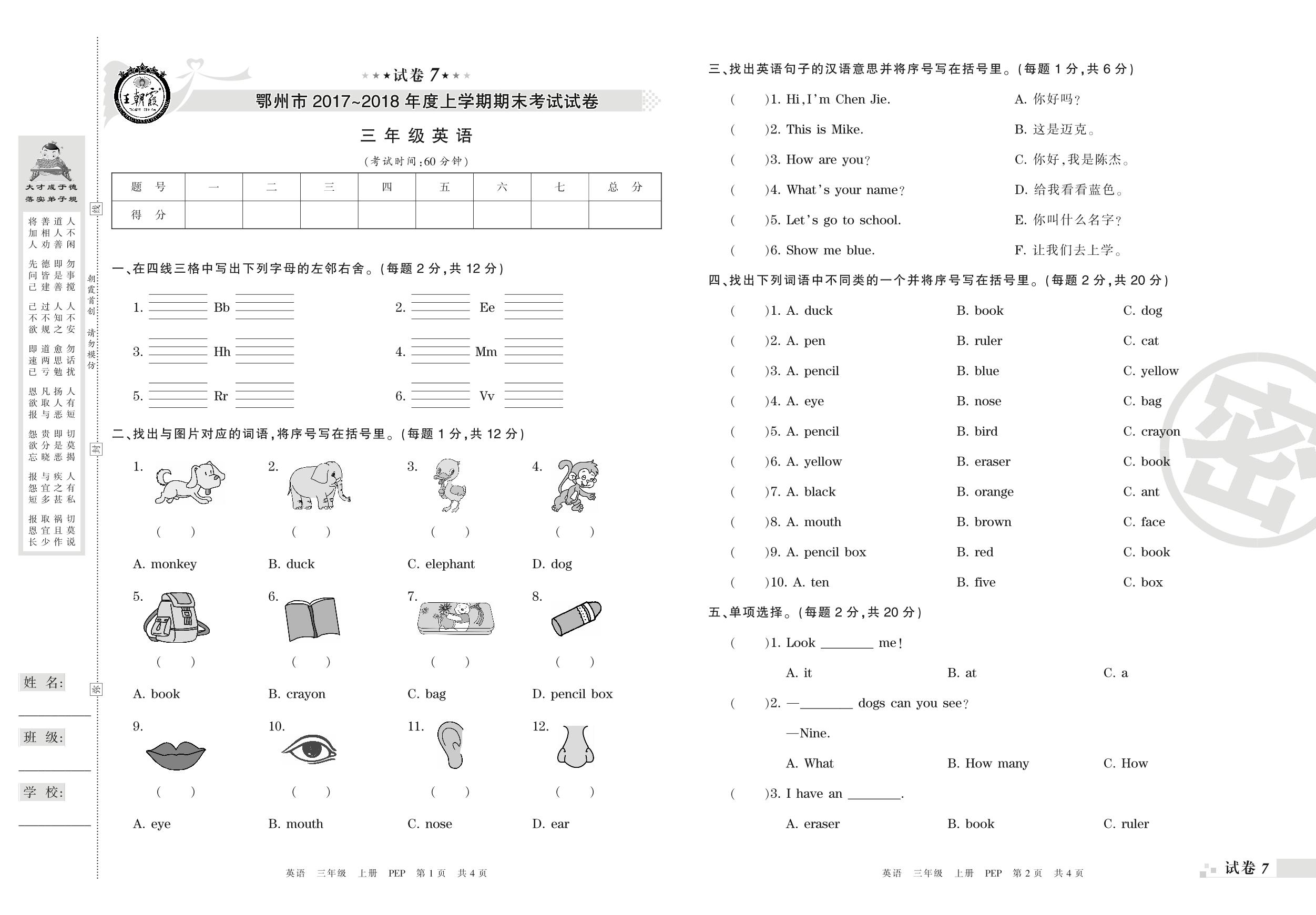 2017-2018学年第一学期鄂州市三年级英语试卷(PEP版)【7】