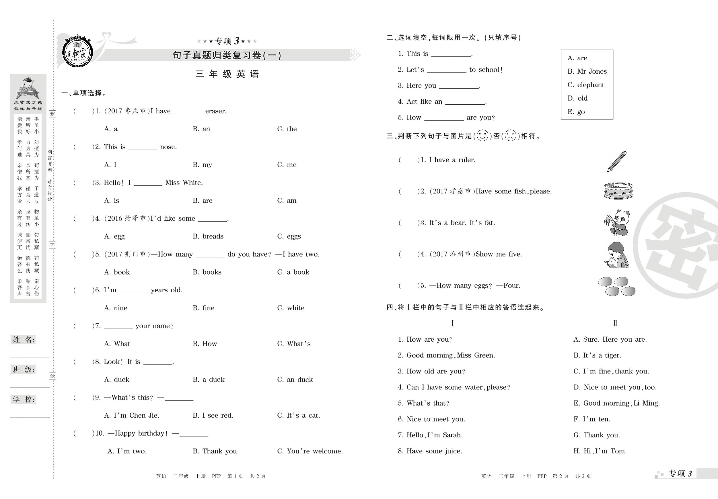 三年级英语人教PEP版(三起始)上册专项卷