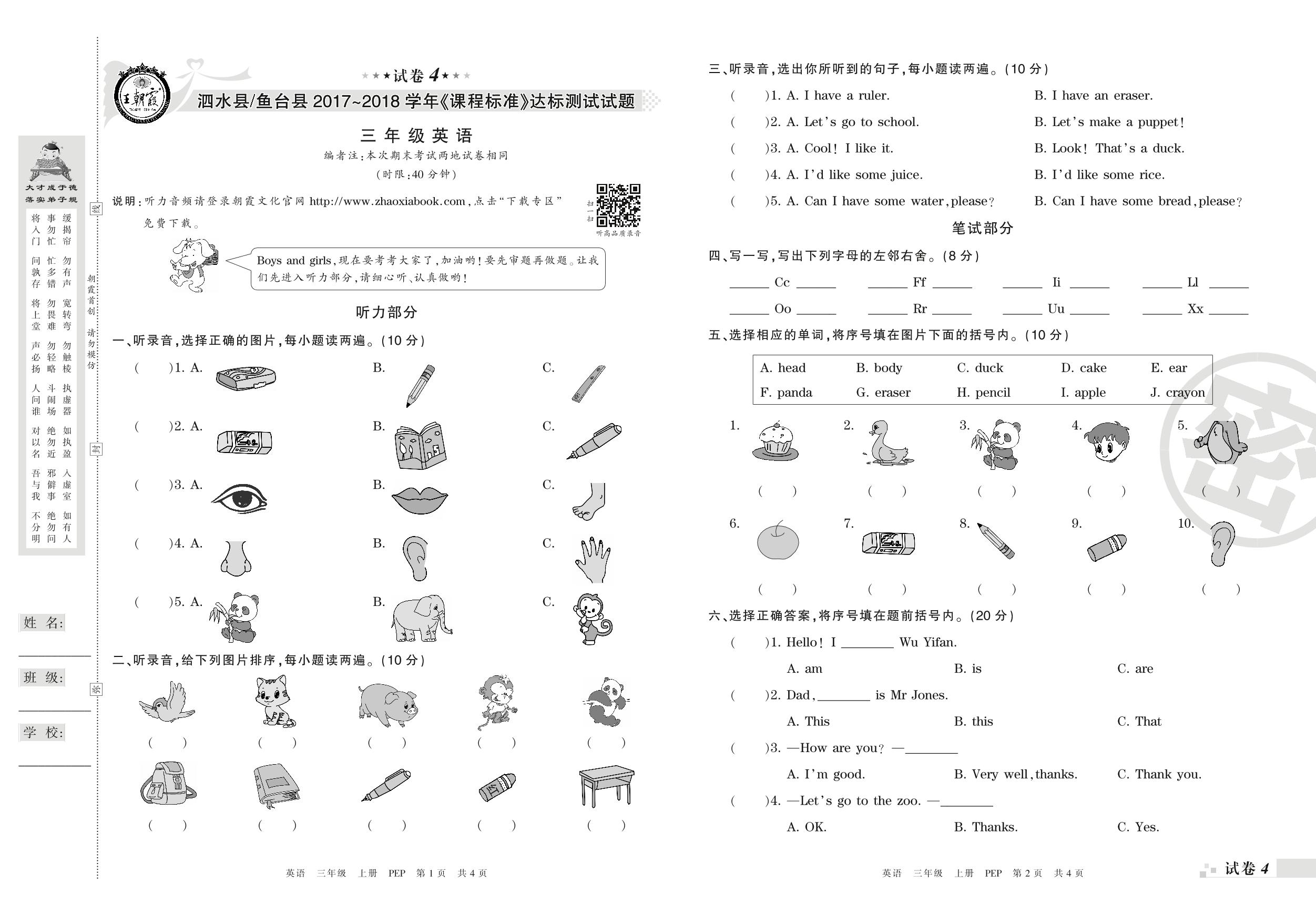 2017-2018学年第一学期济宁市泗水县、鱼台县三年级英语试卷(PEP版)【4】