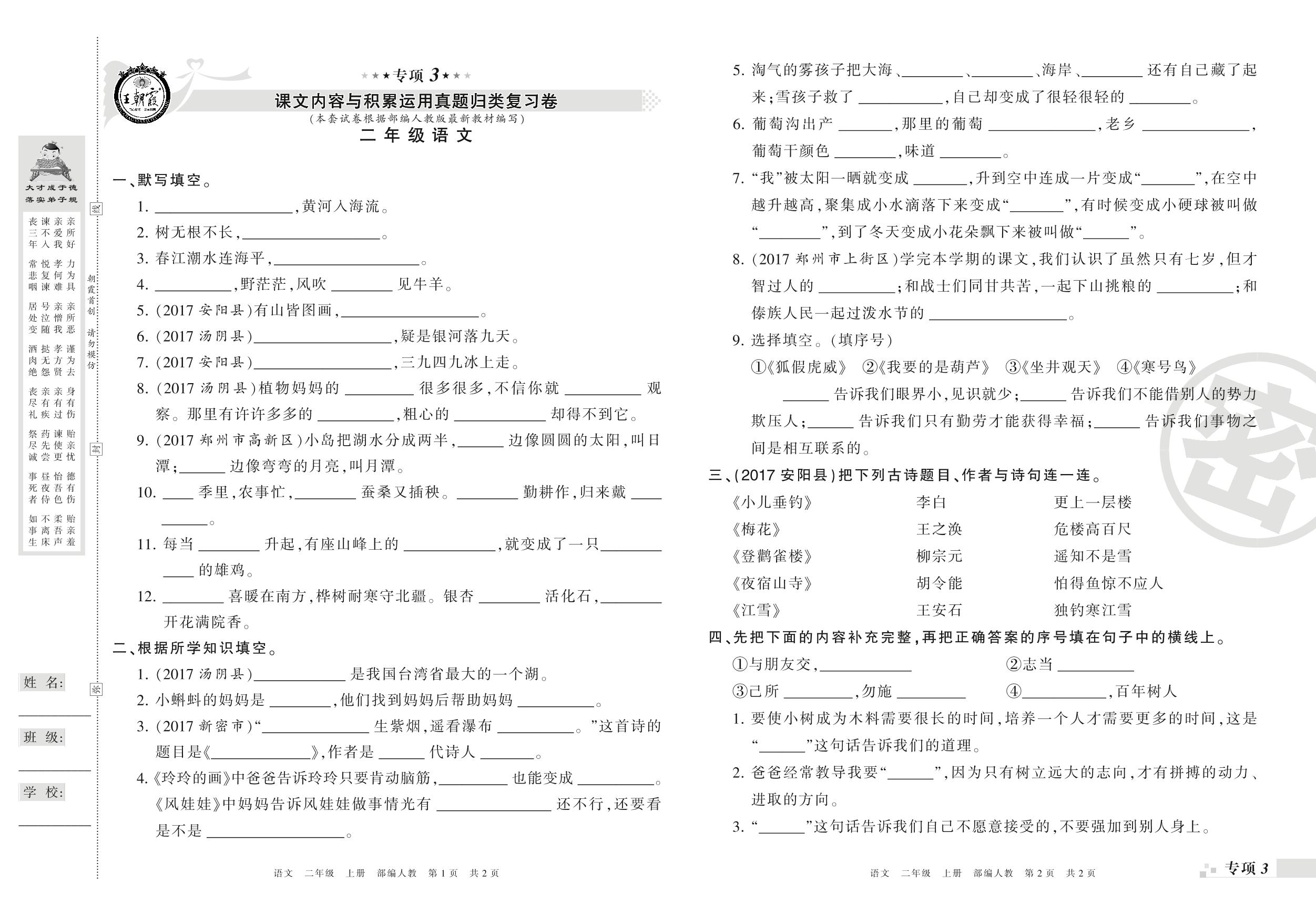 王朝霞期末专项卷——课文内容与积累运用二年级上册语文(人教版)【0】