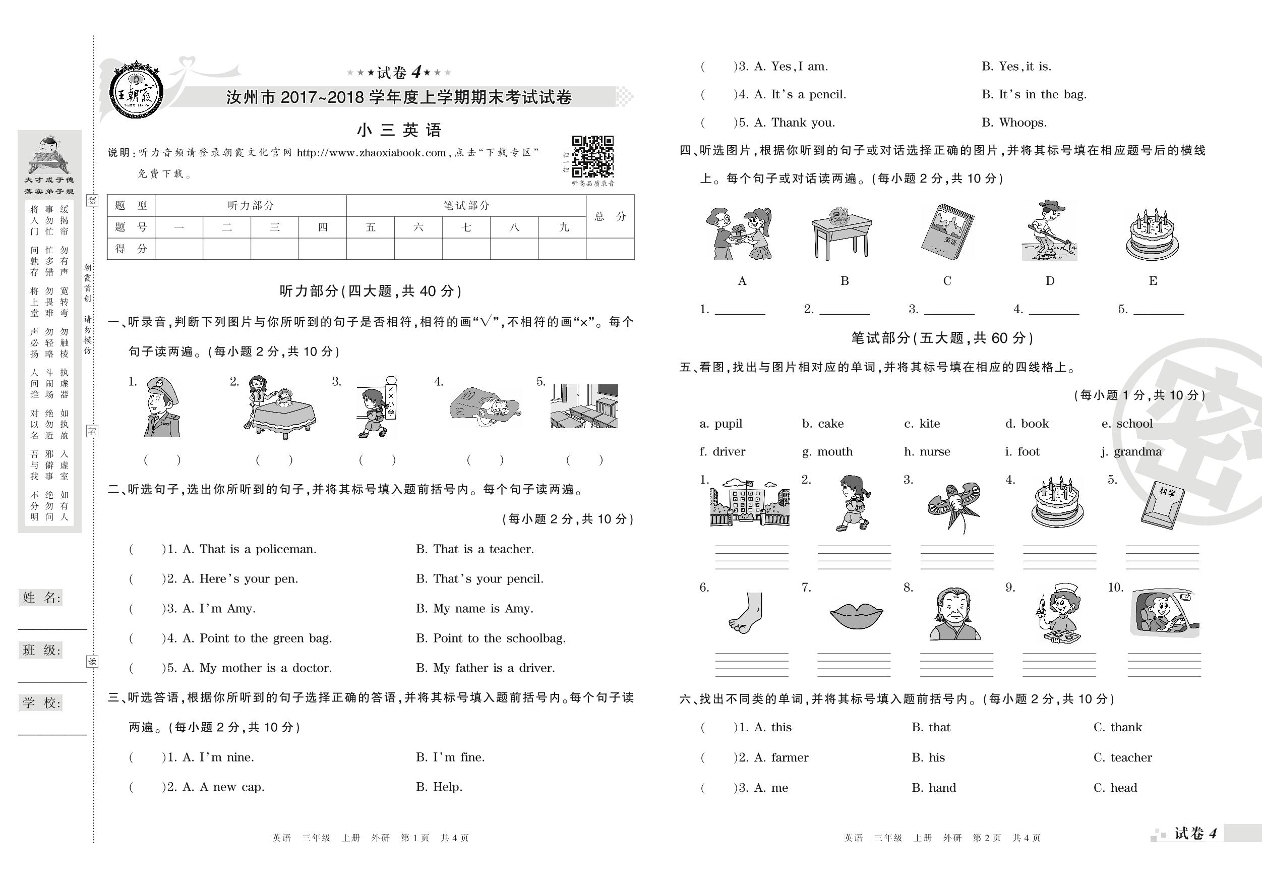 2017-2018学年第一学期汝州市三年级英语试卷(外研版)【4】