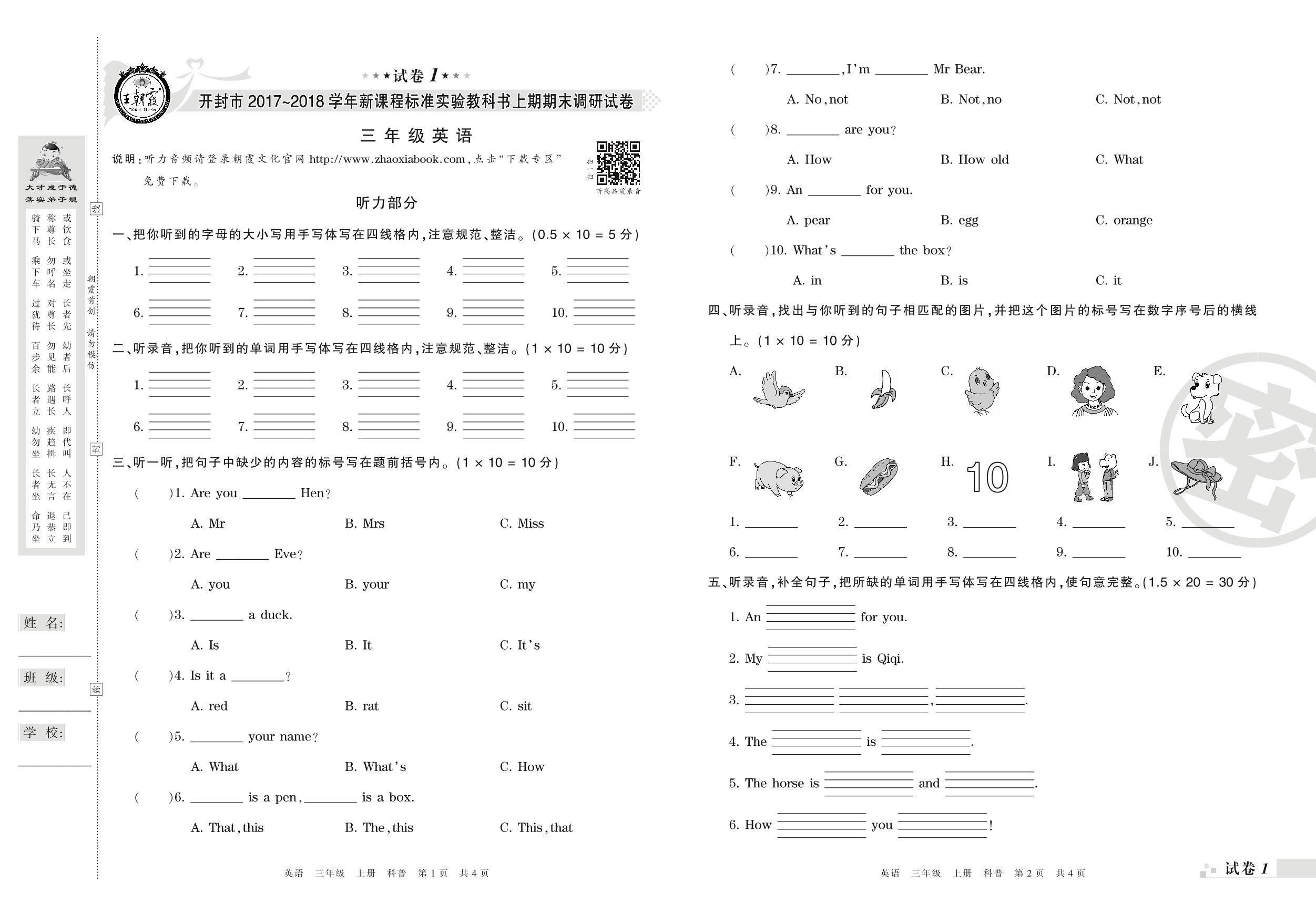2017-2018学年第一学期开封市三年级英语试卷(科普版)【1】